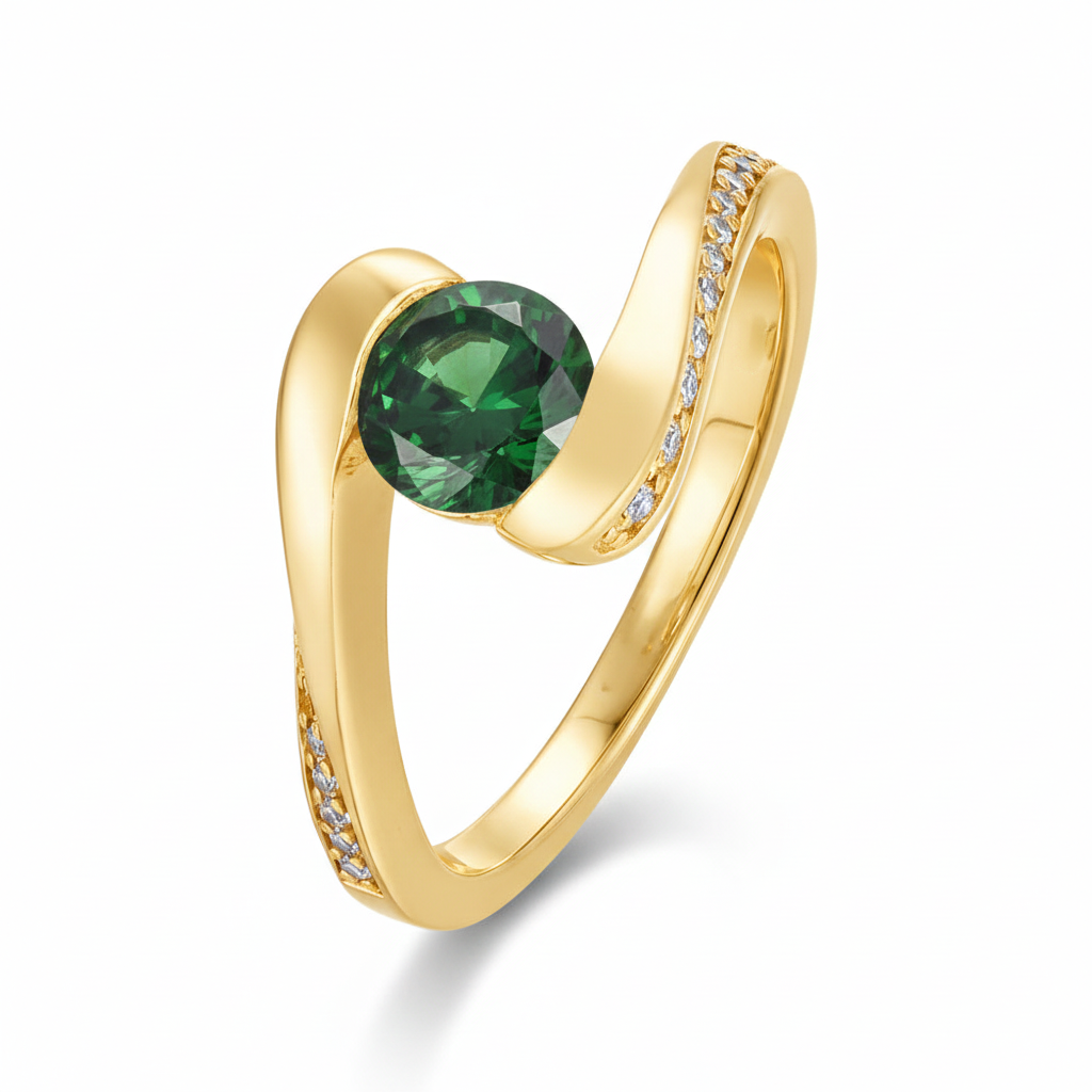 A vivid green stone cradled within sweeping silver curves, symbolizing protection and balance. Subtle diamond accents flow along the band, evoking the elegance of nature and the rare serenity of hidden forests.