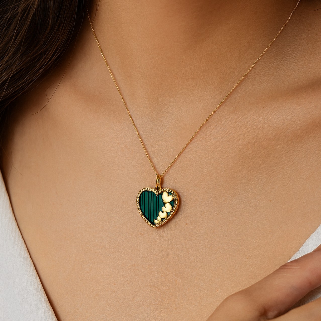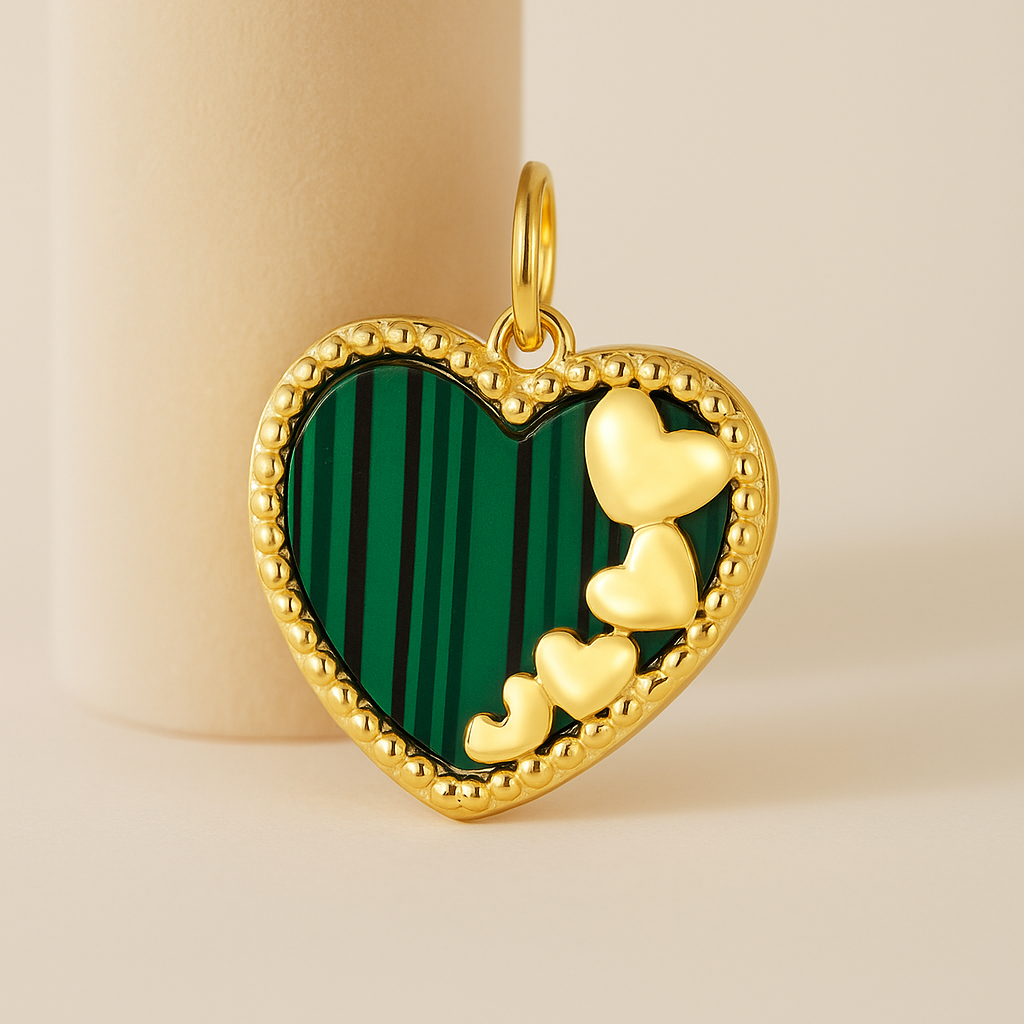 A deep green heart framed in gold and adorned with a cascade of smaller hearts. Symbolizing growth, connection, and love that multiplies, this pendant is both bold and tender — a modern token of devotion.