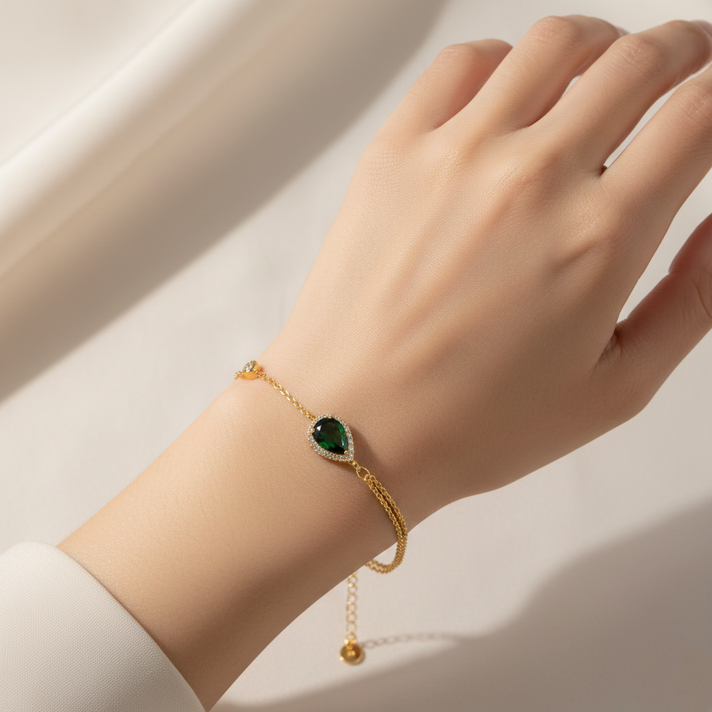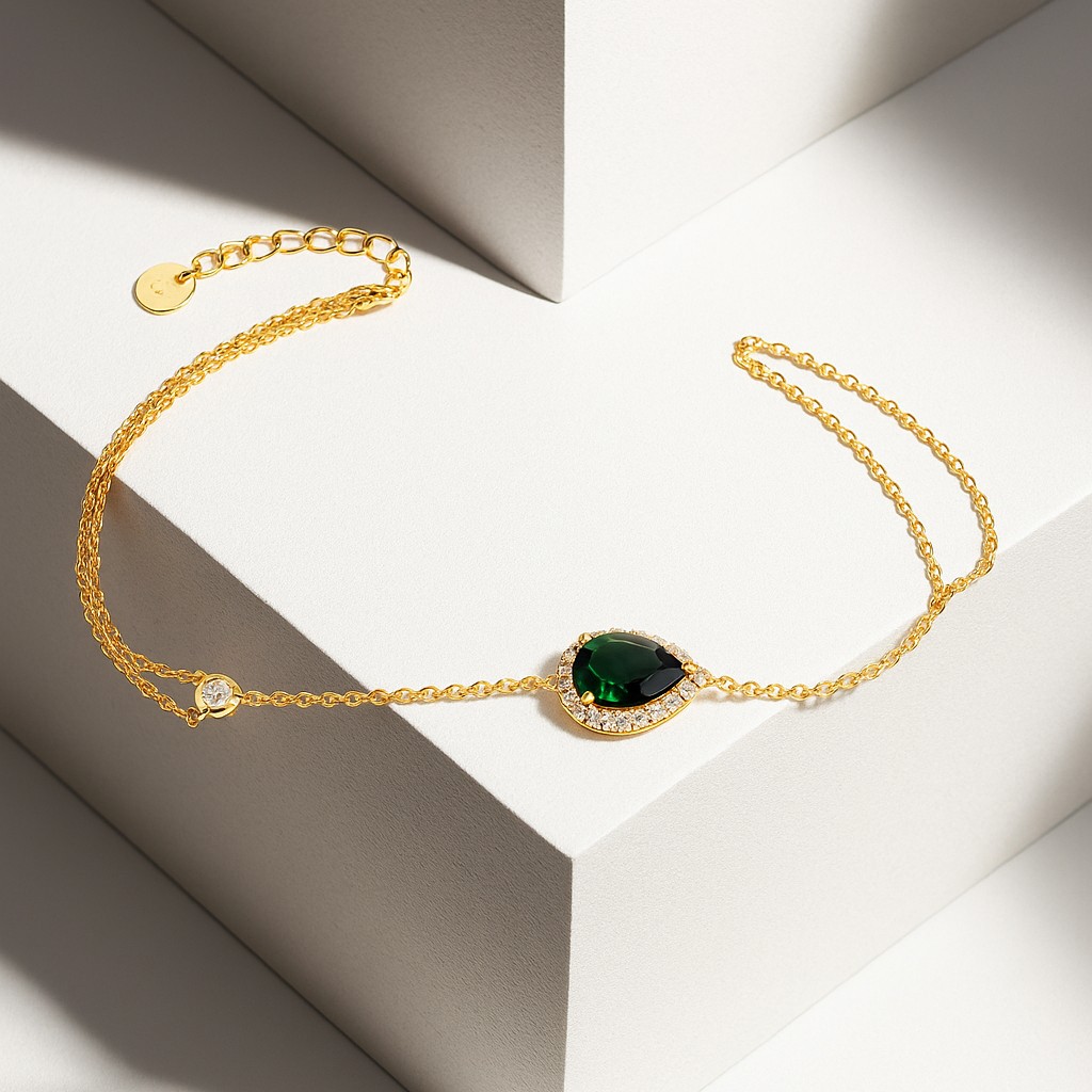 A teardrop emerald-like gem rests within a halo of diamonds, its deep green hue symbolizing renewal and strength. The fine gold chain offers subtle minimalism, allowing the centerpiece to captivate in silence. It is a piece for those who prefer understated drama — a quiet jewel with profound presence.