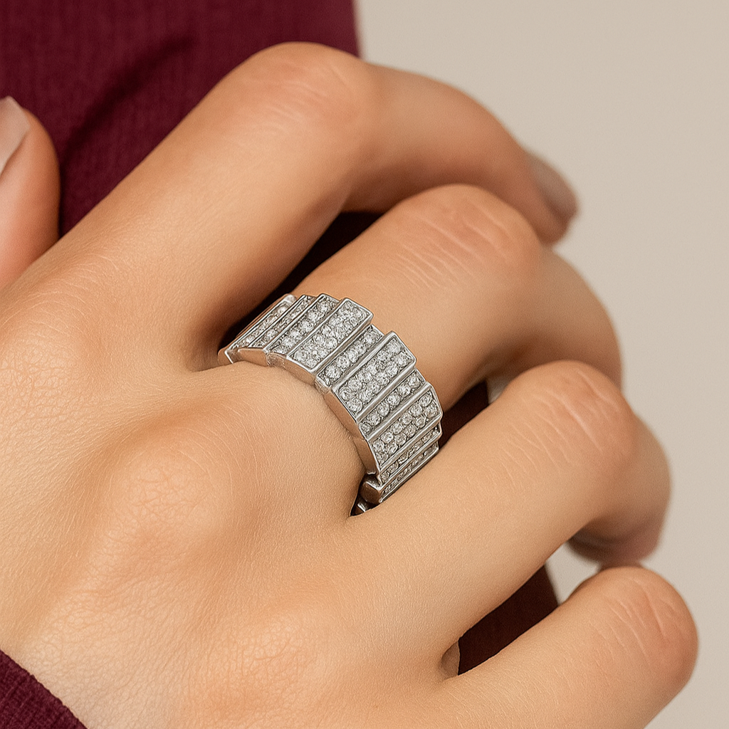 A bold statement of power and refinement, this wide pavé-set band glitters with endless rows of diamonds. Radiant yet commanding, it embodies confidence, luxury, and a brilliance that reigns eternal.