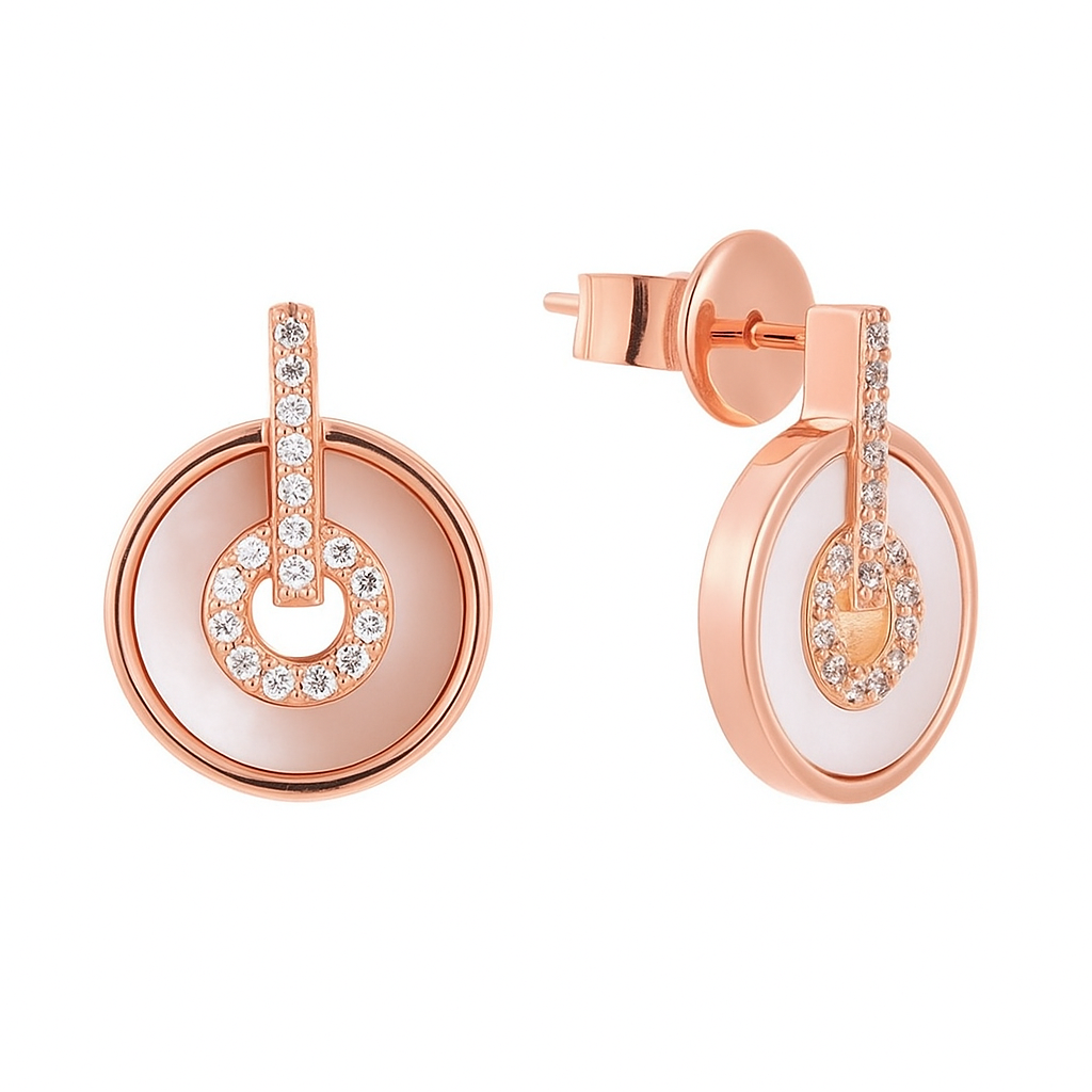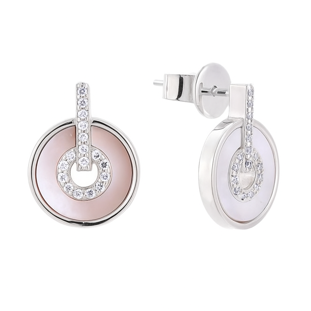 • A bolder expression of the circle motif, these earrings feature pavé-set stones highlighting the mother-of-pearl inlay. Chic, luminous, and perfect for evening radiance.
