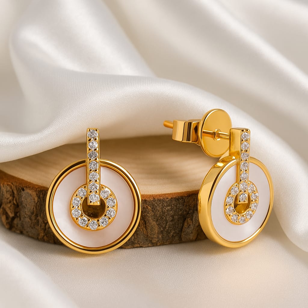 A bolder expression of the circle motif, these earrings feature pavé-set stones highlighting the mother-of-pearl inlay. Chic, luminous, and perfect for evening radiance.