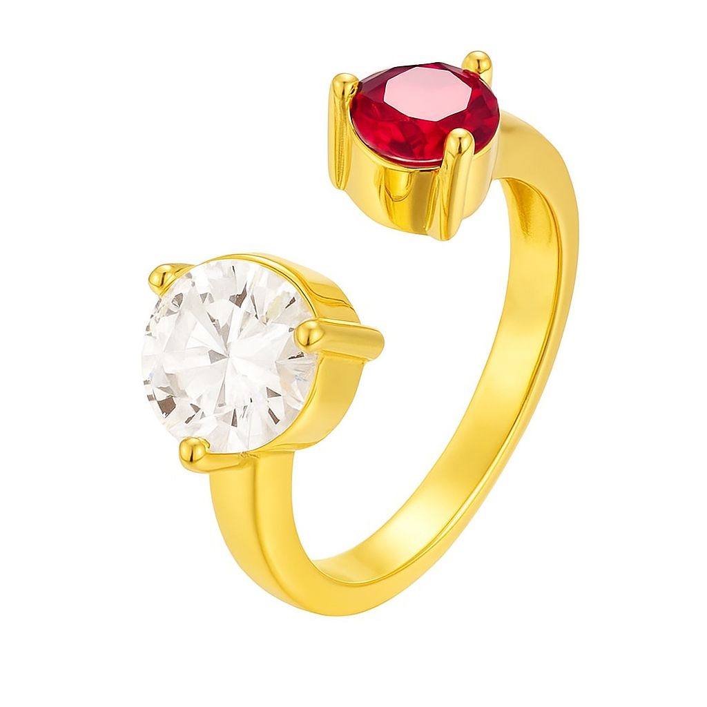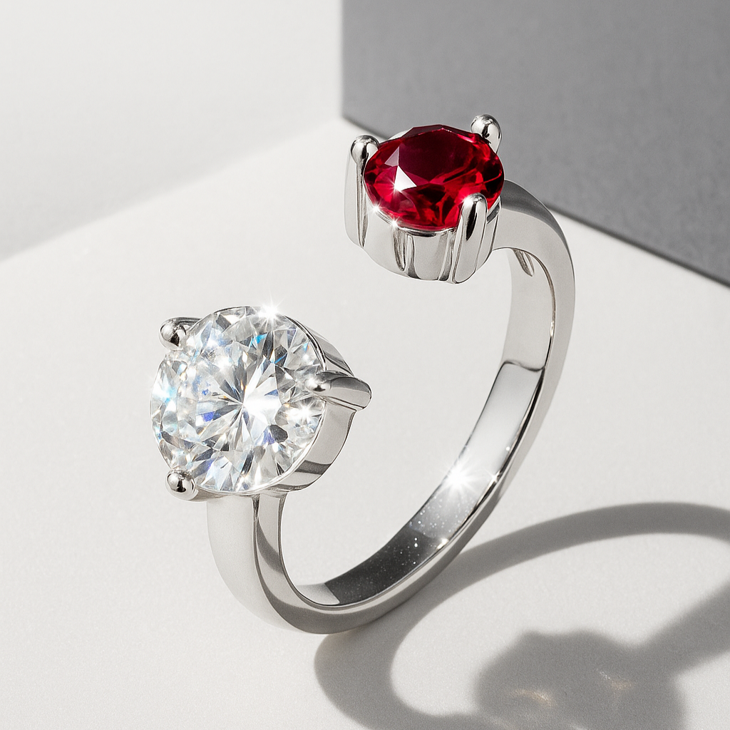 An open-band design featuring two opposing forces: a fiery ruby and a brilliant diamond. This bold pairing represents passion and purity, strength and serenity—two souls eternally intertwined in perfect balance.