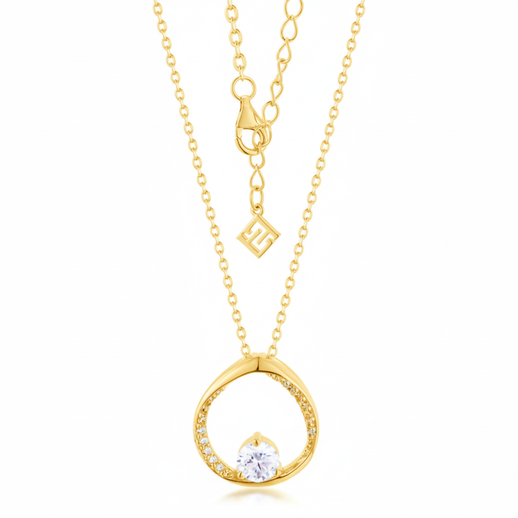 A graceful circular frame holds a radiant centre stone, embraced by a line of pavé-set brilliance. The design whispers of harmony and balance, capturing the beauty of infinite light. A versatile pendant that pairs serenity with luxury.