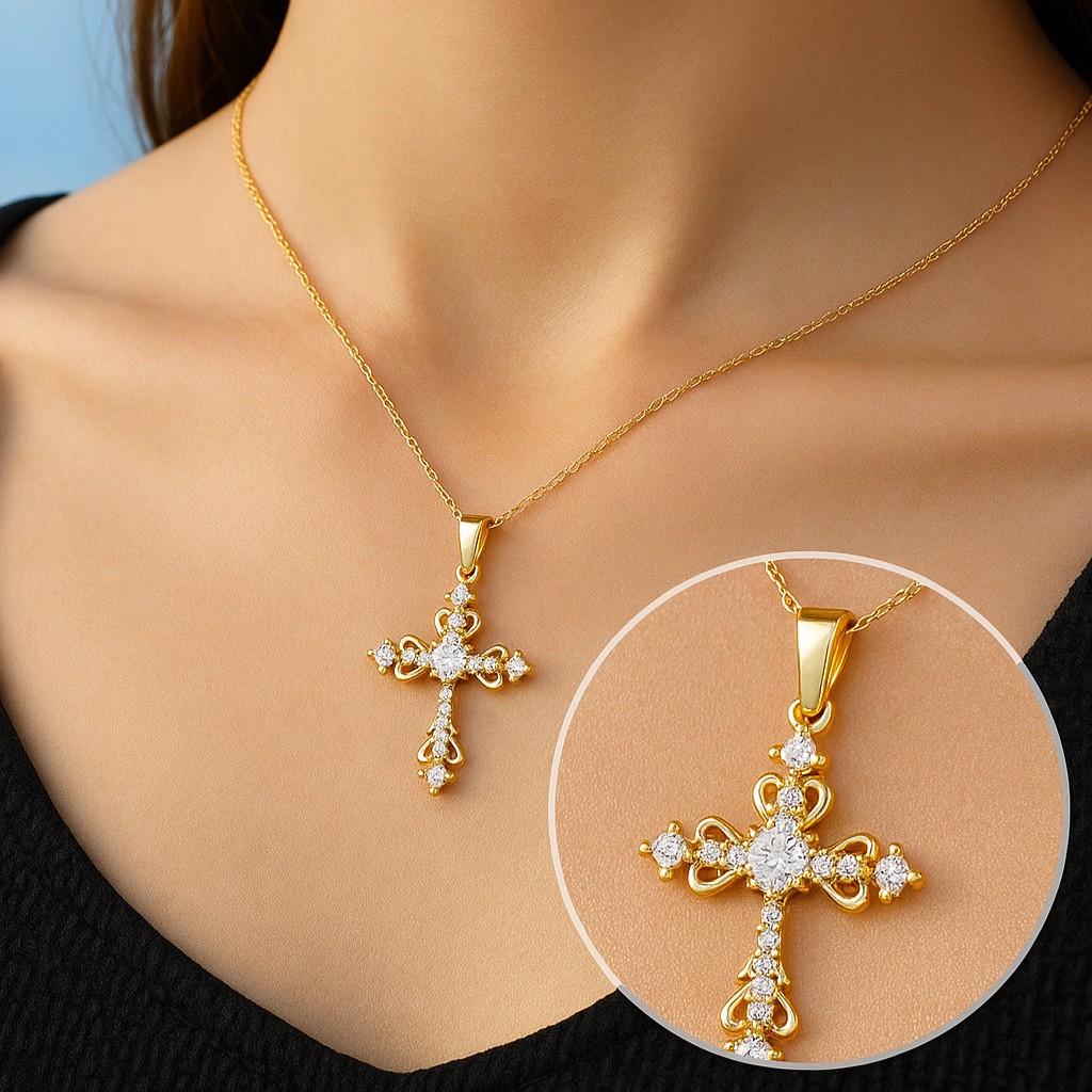 The Eternal Grace Pendant is a luminous testament to both beauty and belief. At its center shines a brilliant VS1 diamond, its light radiating outward through an intricate lattice of smaller stones, forming a refined and harmonious cross motif. The gold frame, delicately sculpted with ornamental curves, elevates the pendant into a piece of both art and devotion. Worn close to the heart, it serves as an emblem of faith, protection, and grace, while its refined silhouette makes it equally suited for everyday wear or cherished ceremonial occasions.