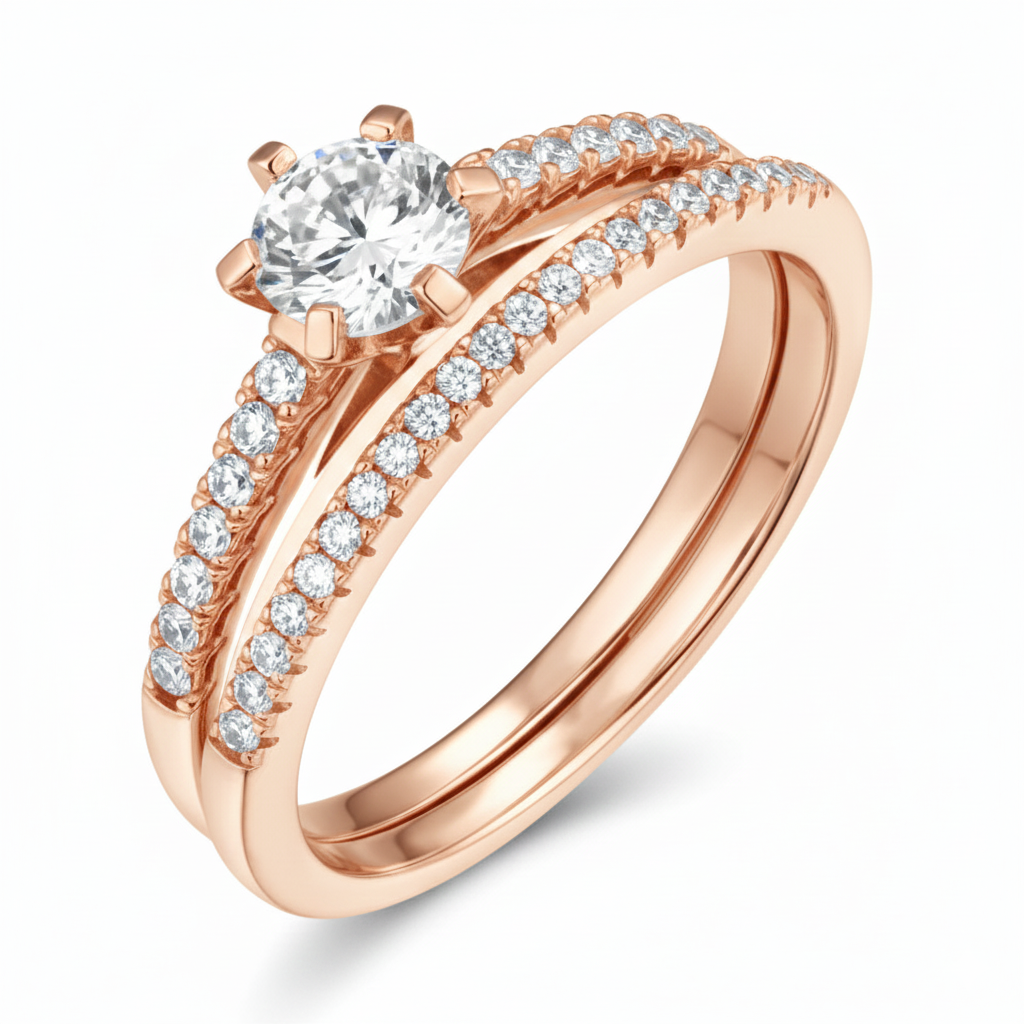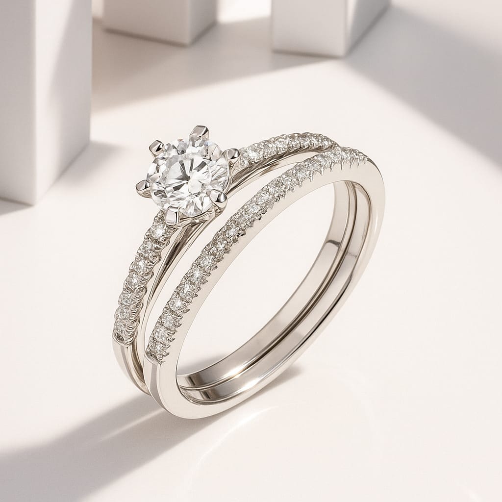 • Two harmoniously paired rings: a classic diamond solitaire with pavé band, complemented by a matching eternity band. Designed for life’s most cherished vows, this set captures devotion and elegance in perfect unison.