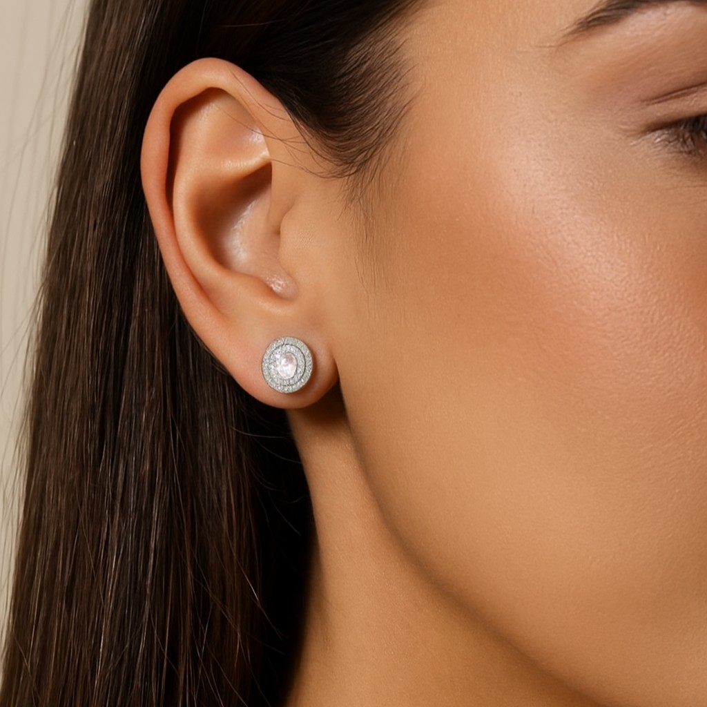 Timeless and luminous, these studs feature customizable diamond centers encircled by twin halos of brilliance. Their delicate yet powerful presence makes them a versatile treasure — equa