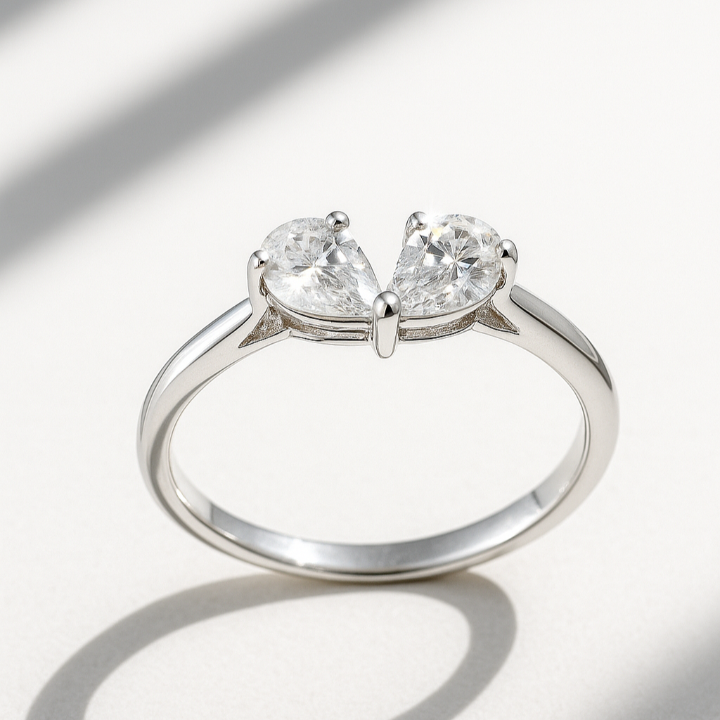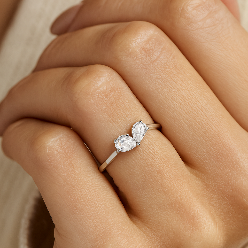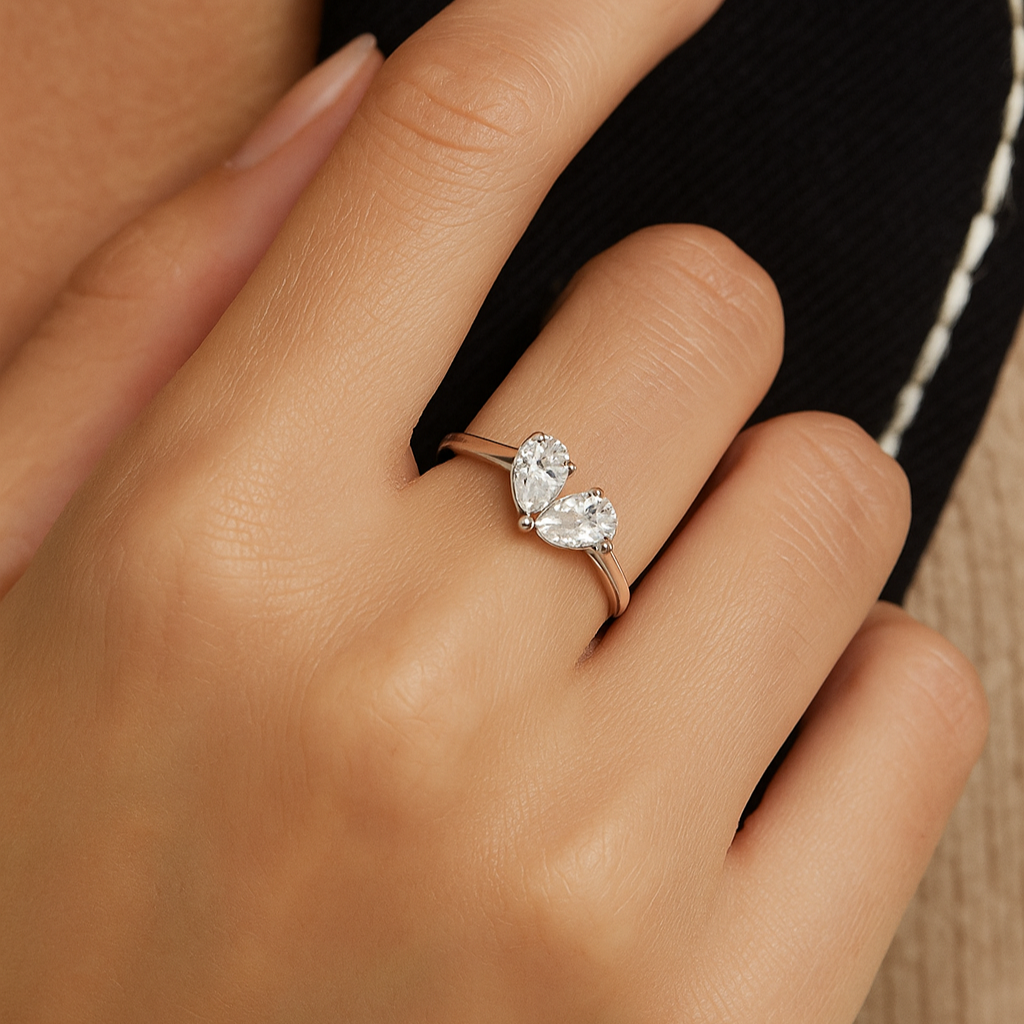 • This elegant Toi et Moi ring celebrates the union of two souls with dual pear-cut diamonds set in perfect harmony. Each stone symbolizes love and destiny converging, embraced by a sleek 18k gold band. Available in white, yellow, or rose gold, this design offers timeless sophistication with VS1 accent diamonds adding brilliance. A modern yet romantic statement, it honors the past, present, and future of love.