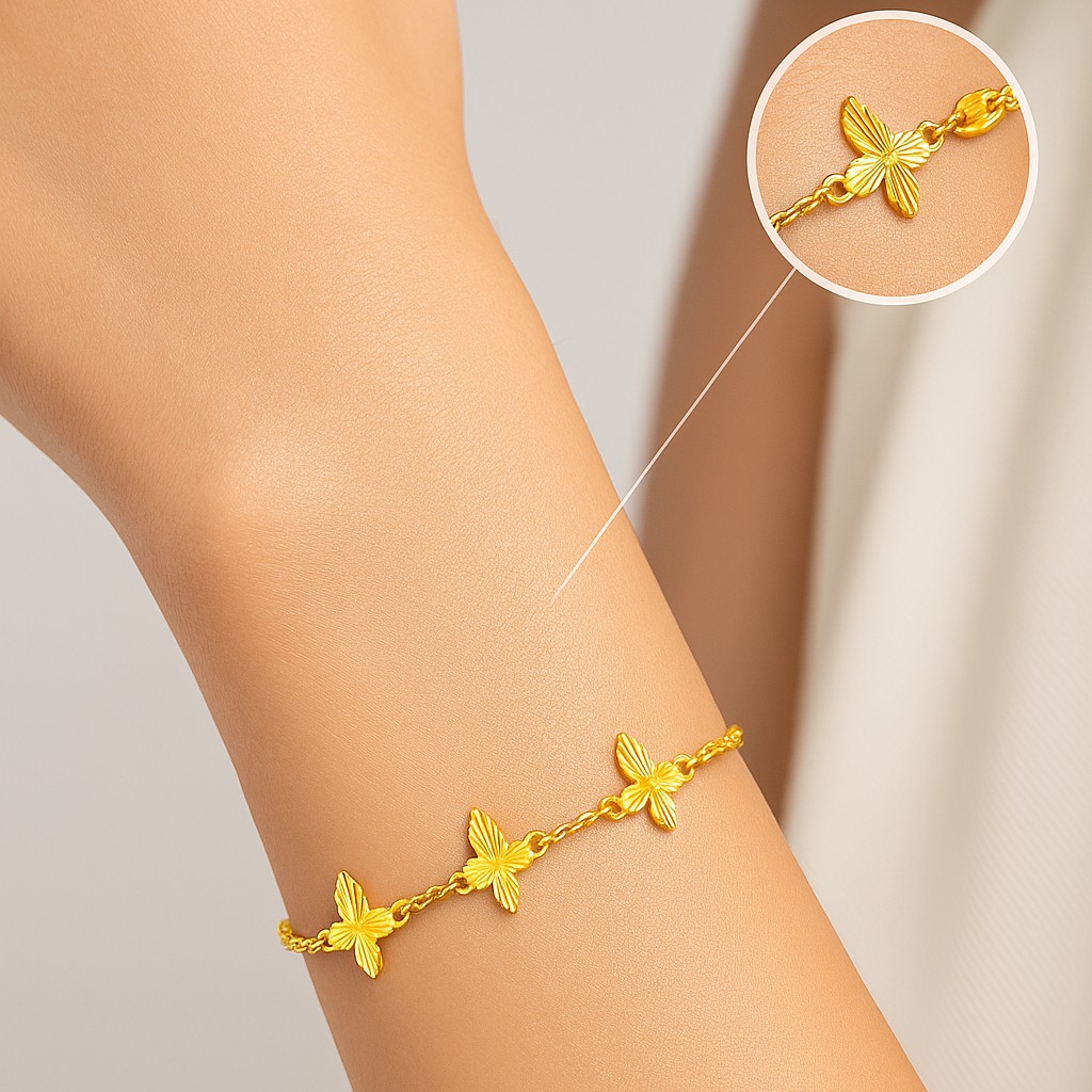 • This exquisite bracelet captures the gentle rhythm of nature with its series of delicately detailed 10 mm butterflies linked gracefully along a slender 916 gold chain. Accented with polished 3 mm beads, it radiates a soft golden glow that moves beautifully with every gesture. Designed to symbolize freedom, beauty, and transformation, this piece adds a timeless feminine touch to any look. Perfect for everyday wear or special occasions, it’s a reminder that elegance can be as effortless as a butterfly in flight.