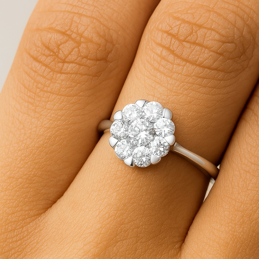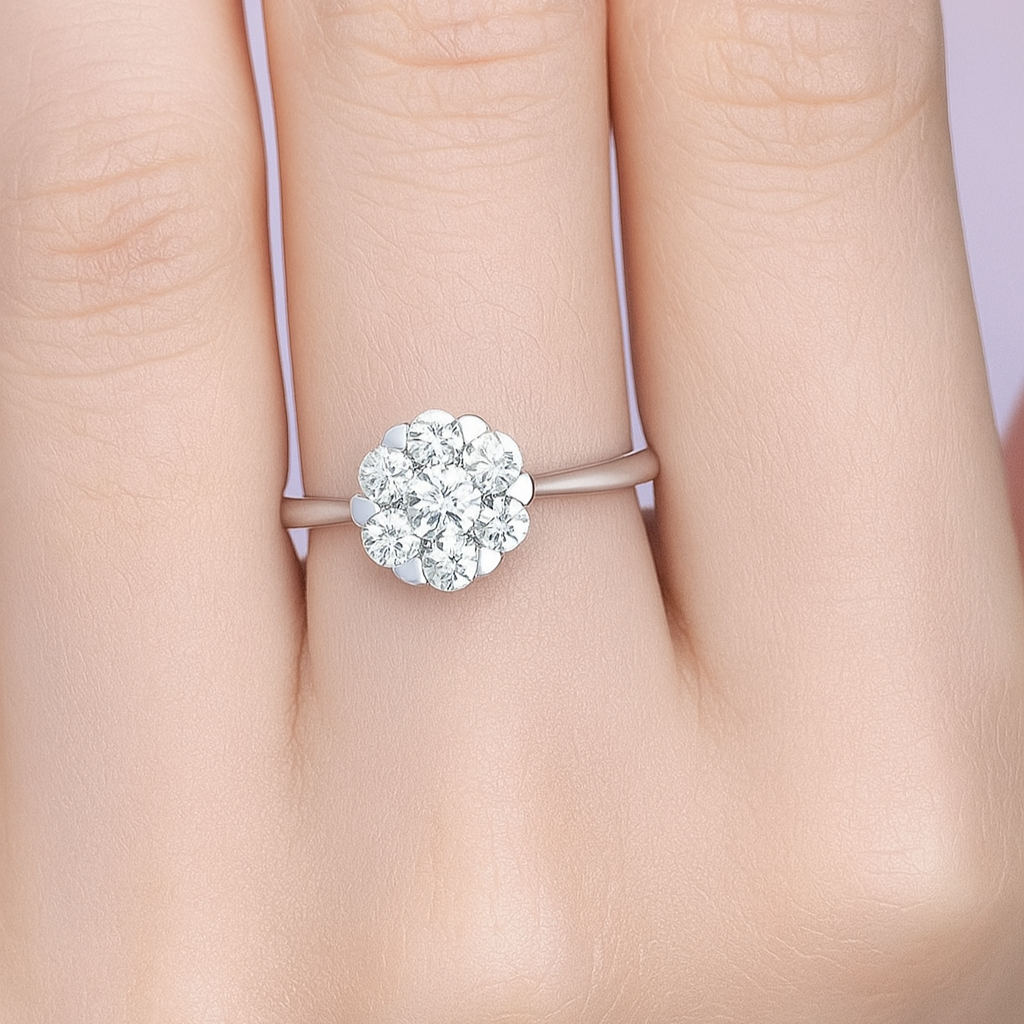 18k white, yellow, or rose gold with VS1 diamonds Crafted with a cluster of perfectly matched diamonds in a floral motif, this ring radiates natural elegance. Sparkling with every movement, it is a graceful ode to nature’s beauty and eternal femininity.