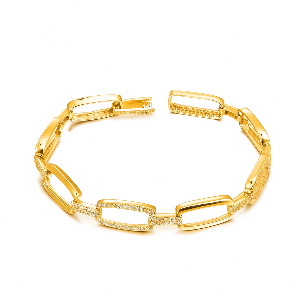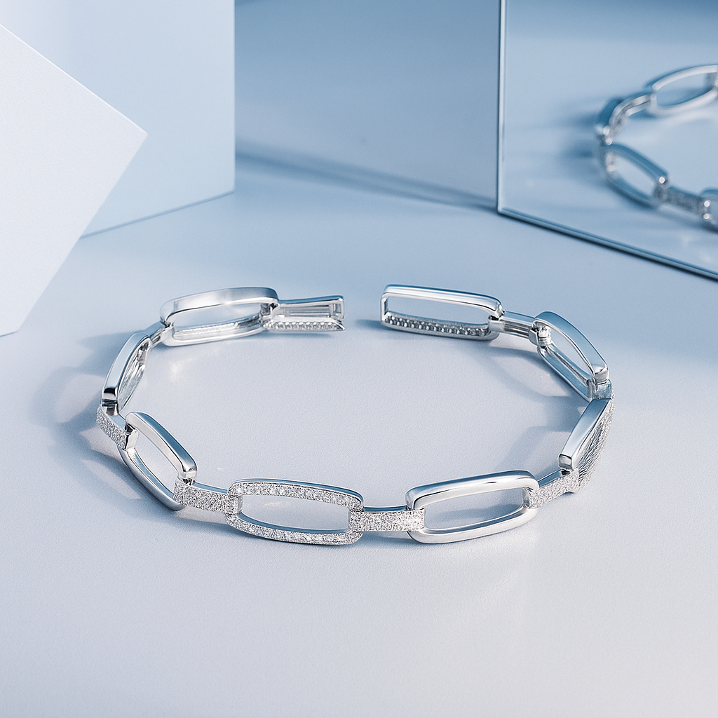 A modern statement of refined minimalism, this bracelet unites bold rectangular links with delicate detailing that catches the light at every angle. Its clean geometry symbolizes strength, structure, and timeless sophistication — the kind of quiet luxury that whispers rather than shouts. Sleek yet substantial, it is a piece designed for those who see beauty in balance and power in restraint.