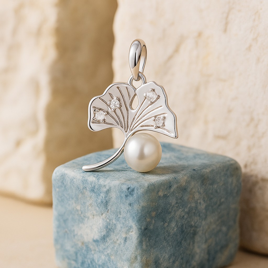 • The Gingko Grace Pendant is a celebration of delicate artistry, with a lustrous pearl nestled against the flowing lines of a gingko leaf. Sparkling diamond accents glisten along the veins of the leaf, mirroring morning dew kissed by sunlight. The pendant carries a sense of serenity and timeless femininity, offering a graceful statement for everyday elegance or special occasions.