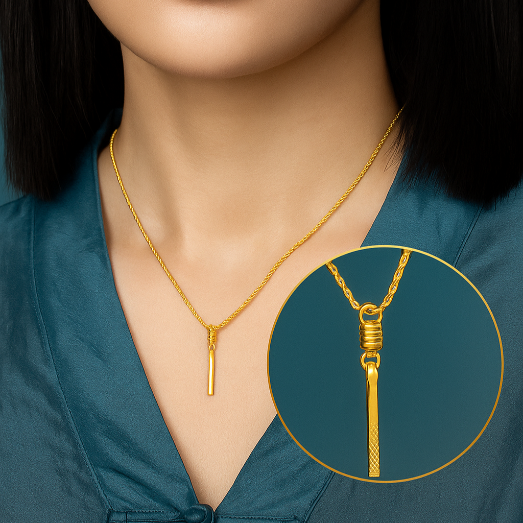 • Crafted in lustrous gold, the Gleaming Luxe Gold Fo Pendant exudes elegance with its sleek linear form and textured detail that catches the light beautifully. Its refined design blends modern minimalism with classic charm, making it a versatile statement for any occasion. This pendant is more than jewelry—it’s a symbol of grace and prestige, perfect for those who appreciate understated luxury.