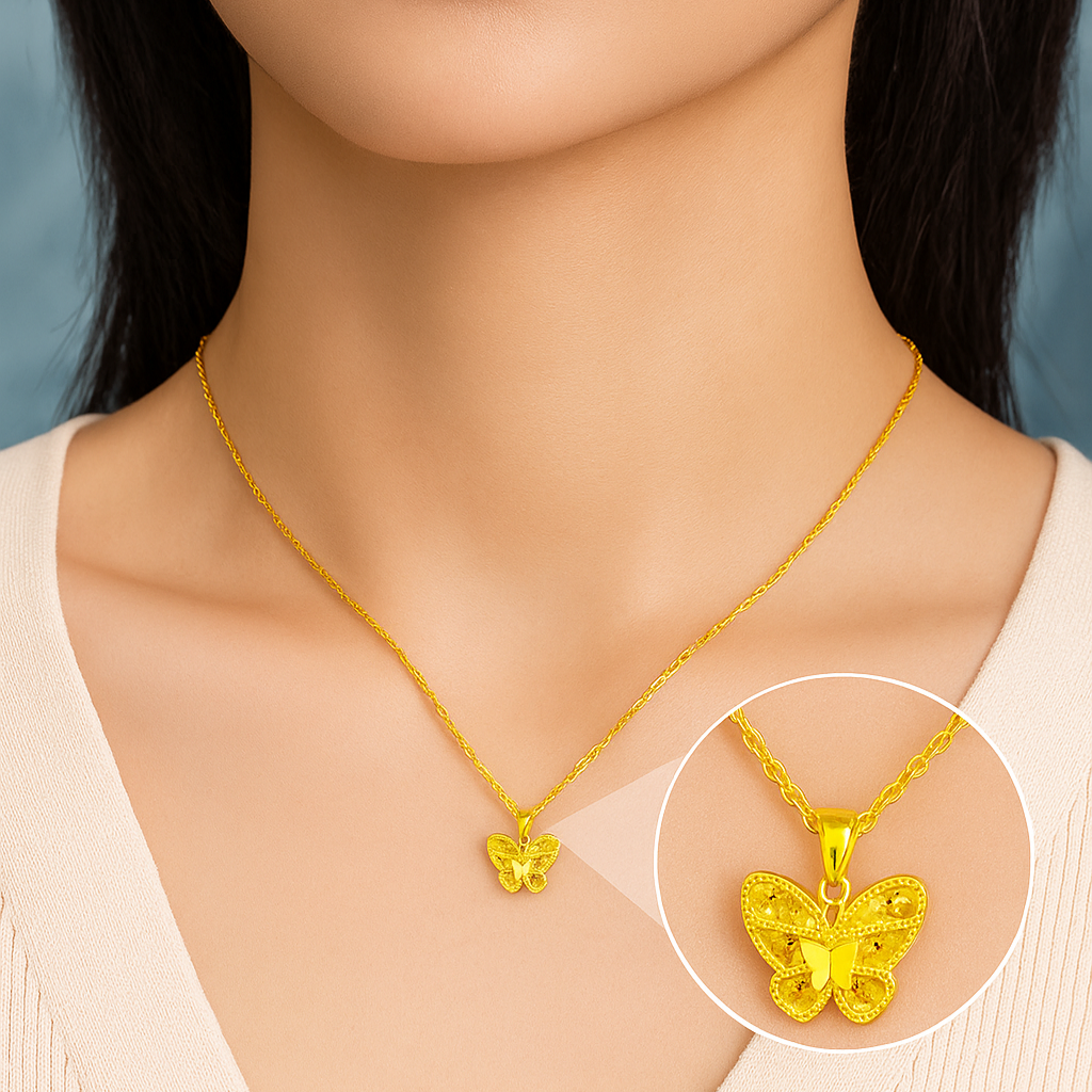 A graceful gold butterfly pendant that captures the essence of transformation and beauty.