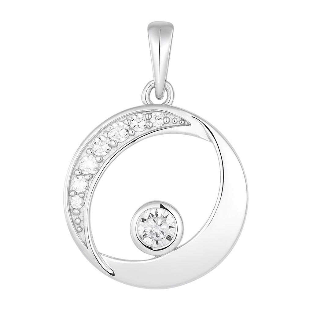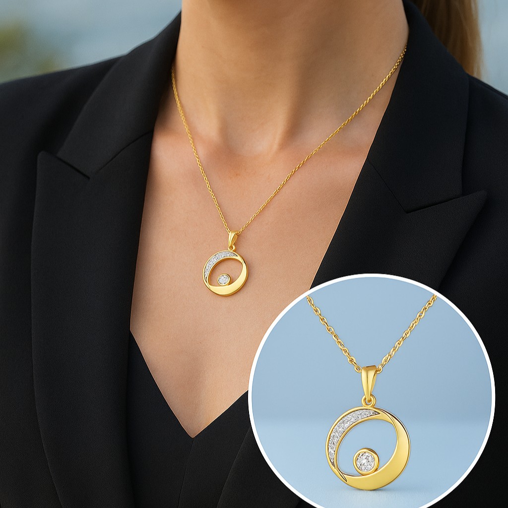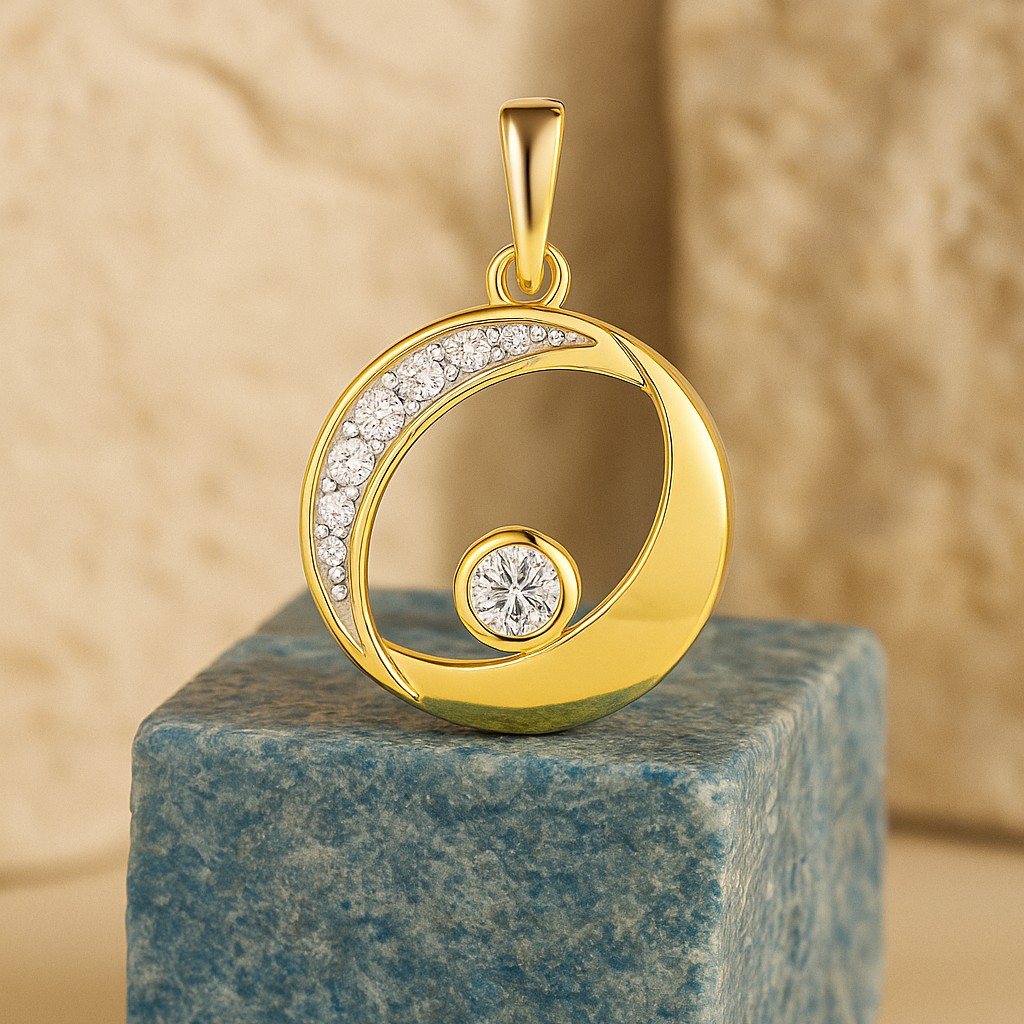 A sweeping arc of diamonds intersects with a golden circle, embracing a brilliant solitaire at its core. Like a celestial dance between sun and moon, this pendant glows with cosmic elegance and infinite charm.