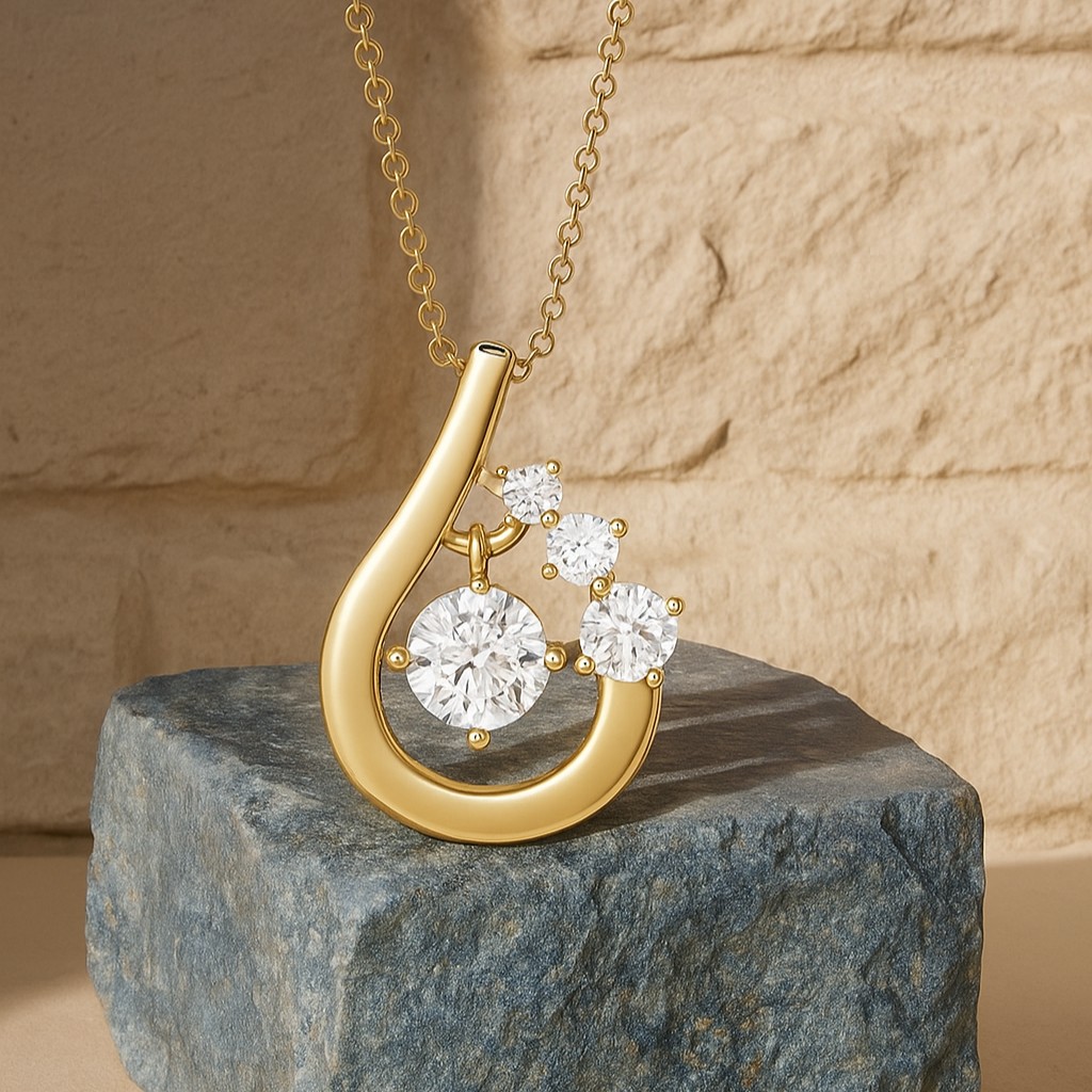 • A fluid swirl of polished gold curves into an eternal embrace around a central round diamond, enhanced by a cascade of VS1 diamonds that shimmer like falling stardust. This pendant represents unity, protection, and the power of bonds unbroken.