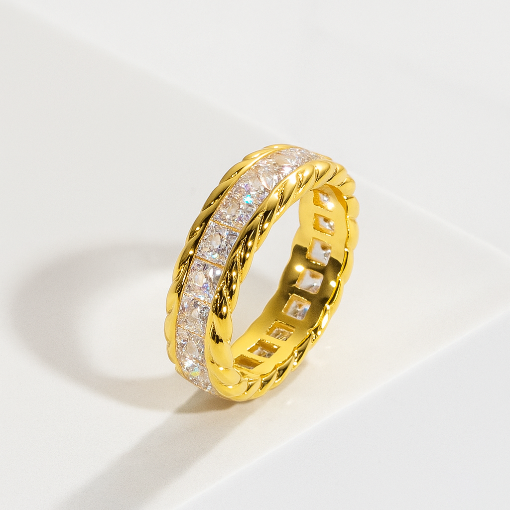 18k yellow, white, or rose gold with VS1 diamonds Waves of gold intertwine with sparkling diamonds in this eternity band, symbolizing endless love and unity. Bold yet graceful, it is a statement of devotion destined to shine for generation