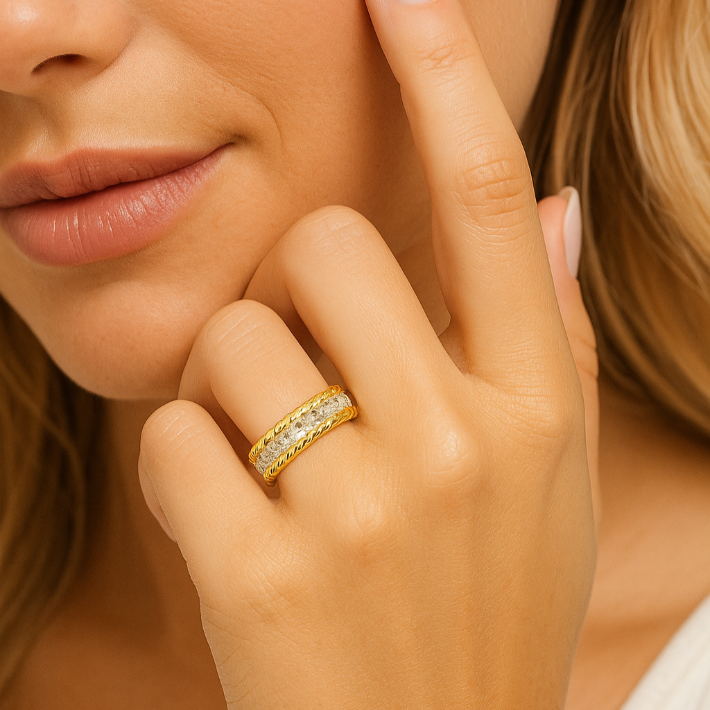 Waves of gold intertwine with sparkling diamonds in this eternity band, symbolizing endless love and unity. Bold yet graceful, it is a statement of devotion destined to shine for generation