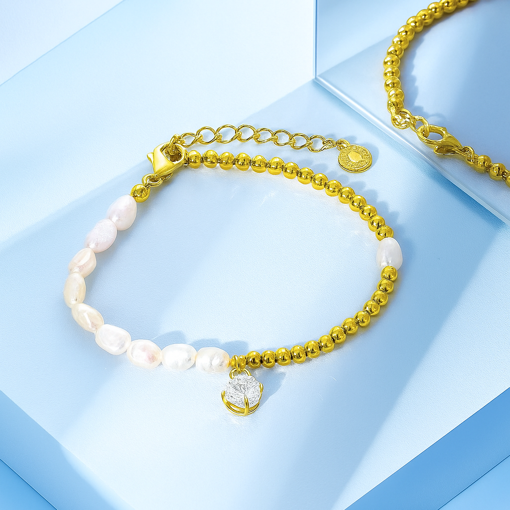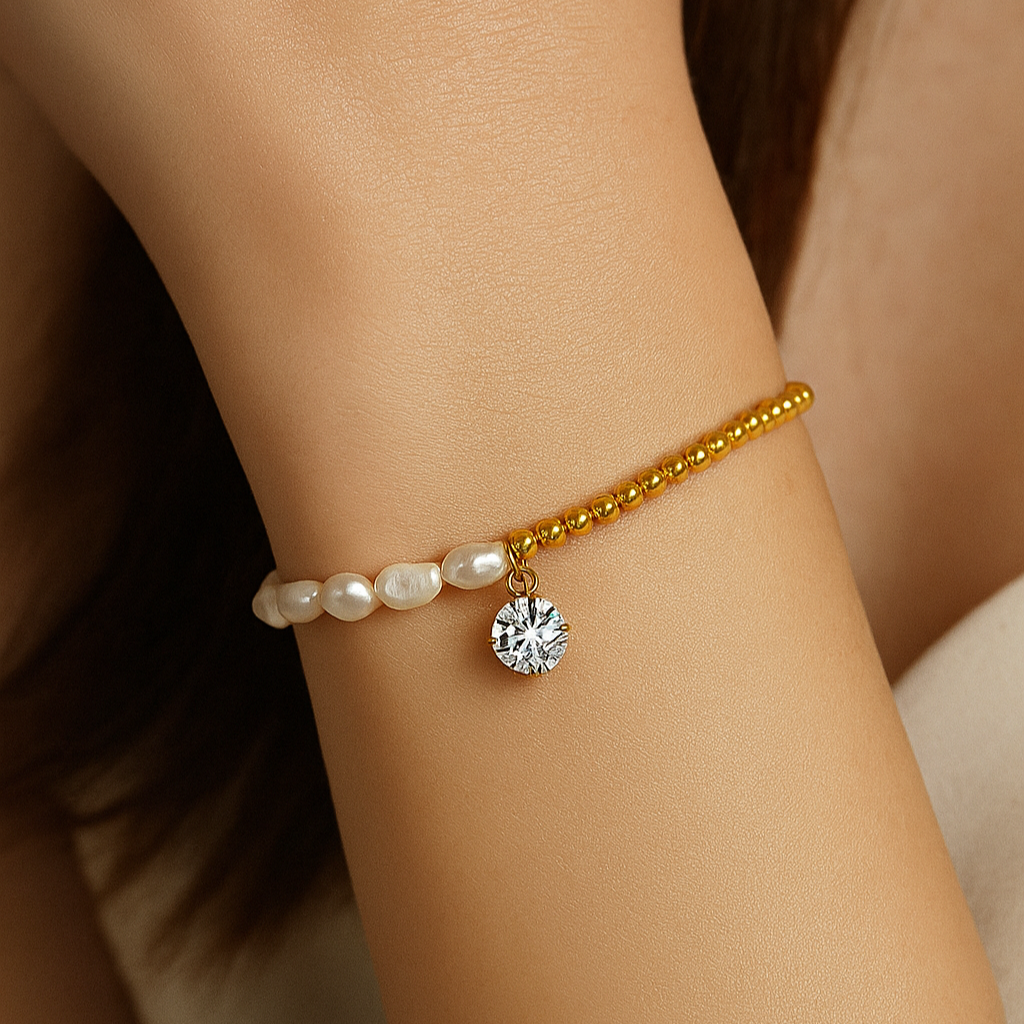 Balancing modernity and romance, this bracelet alternates lustrous freshwater pearls with polished golden beads, crowned by a heart charm set with a VS1 diamond. A talisman of love, it is both tender and luxurious—perfect for celebrating life’s most precious bonds.