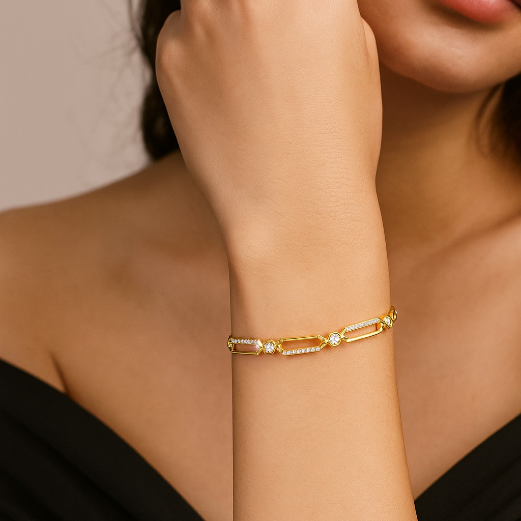 A contemporary design featuring geometric gold links, accentuated by diamond brilliance. This piece is a bold blend of tradition and modernity, perfect for the confident tastemaker.