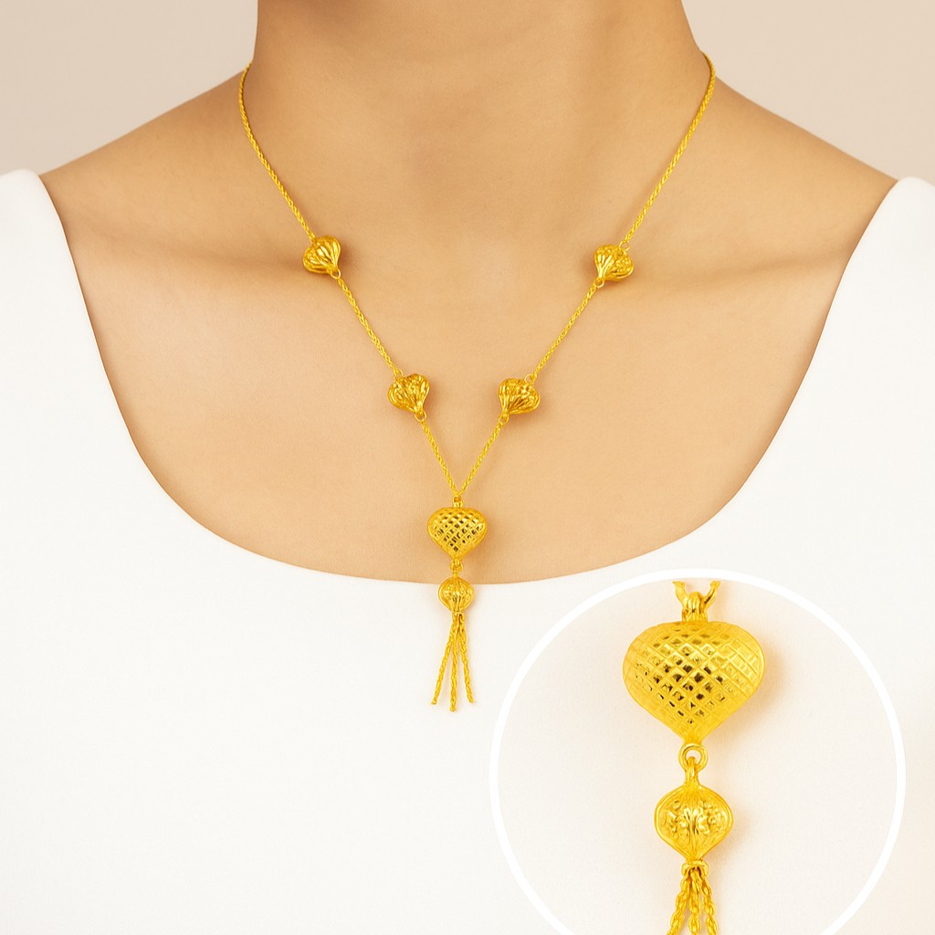 • Radiate warmth and affection with this elegant 46cm 916 gold necklace, beautifully designed with a 2g central heart pendant and charming mini heart details along the chain. Each heart shimmers with intricate texture, symbolizing love, connection, and elegance in every detail. Lightweight yet luxurious, it’s the perfect piece to express affection — whether for yourself or someone special. A graceful fusion of romance and modern gold artistry.