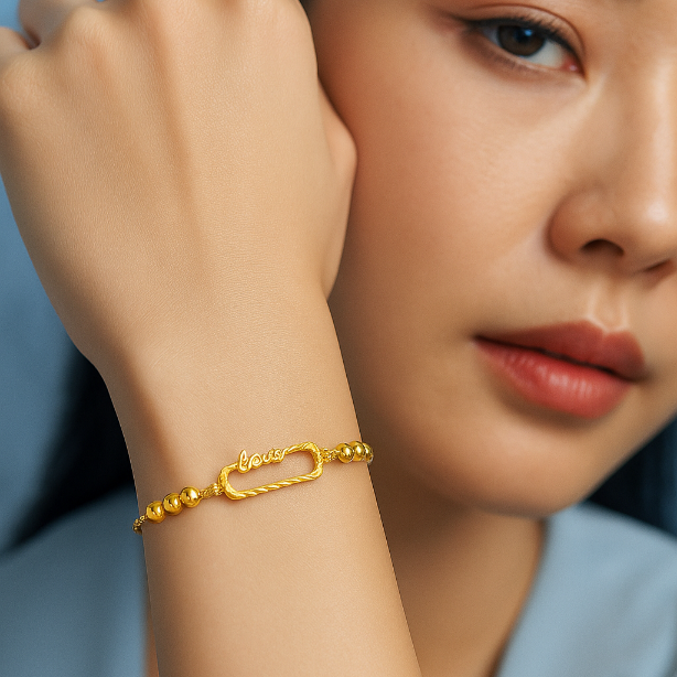A delicate gold bracelet that whispers elegance and affection through its graceful “love” motif and modern bead design.