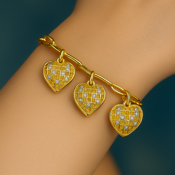 • The Golden Radiance Triple Heart Bracelet shines with a mosaic of faceted patterns, reflecting light in every golden heartbeat. Each heart charm glows with intricate detailing, symbolizing love, strength, and refined grace. The bold chain design adds a contemporary edge, making it a perfect balance of elegance and confidence. A statement of pure sophistication — crafted to dazzle, destined to be adored.