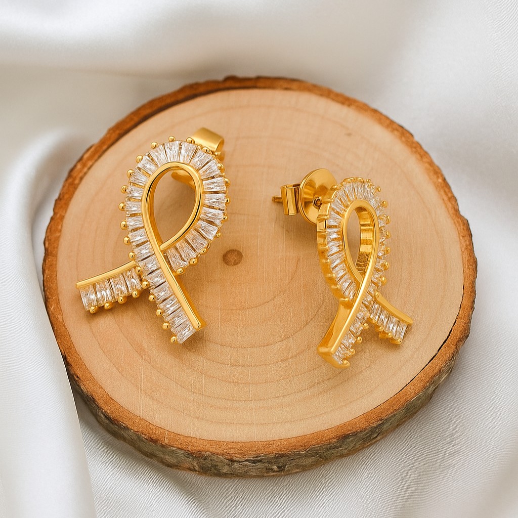 Baguette-cut stones curve gracefully in a ribbon design, symbolizing elegance, resilience, and artistry. The Golden Ribbon earrings glow with contemporary charm and bold sophistication.