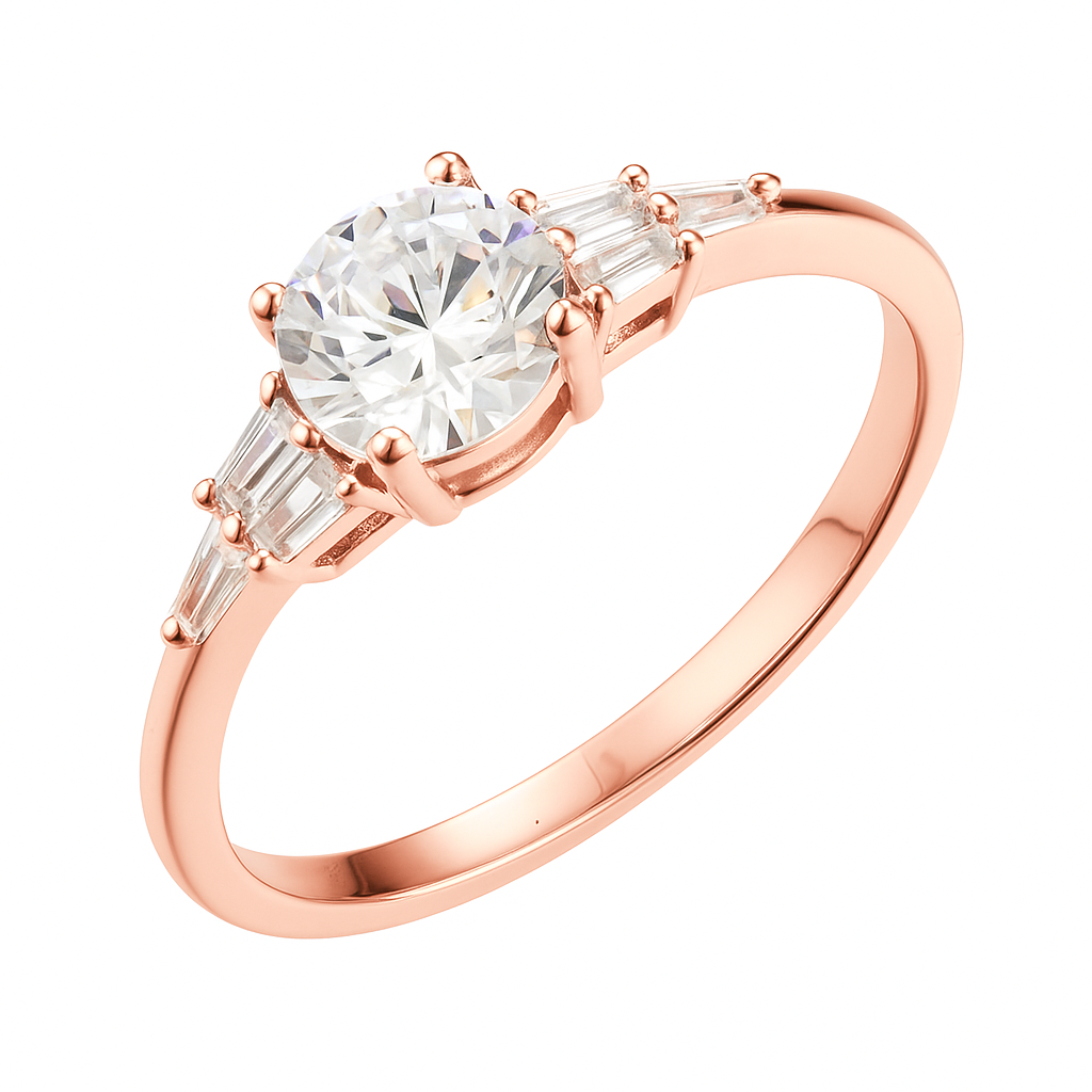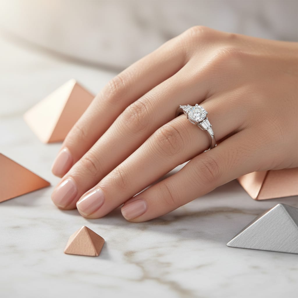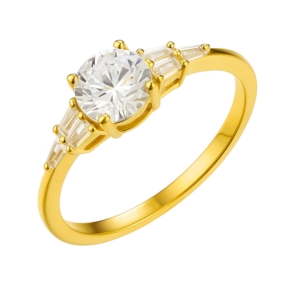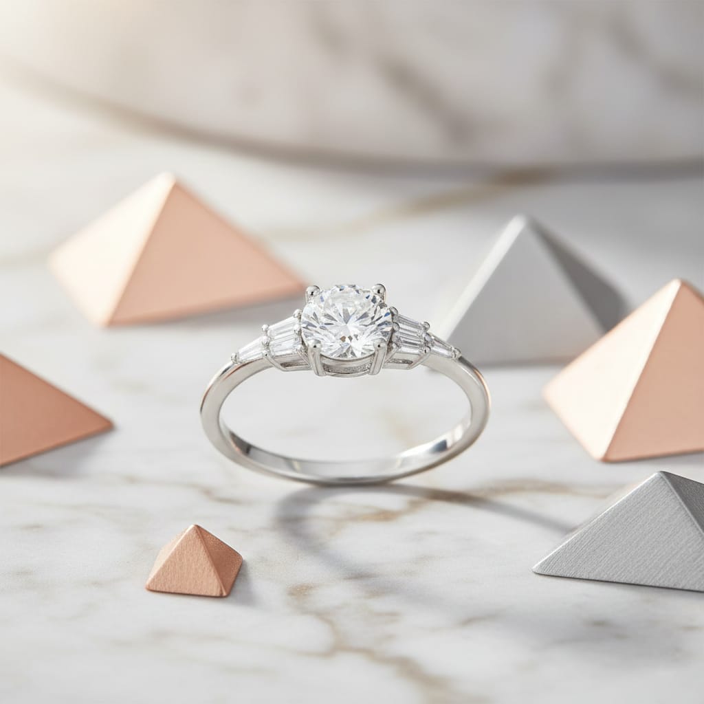 A refined trio of brilliance: one luminous round center stone framed with perfectly angled baguettes. A study in balance, precision, and timeless sophistication, designed to echo eternal harmony.