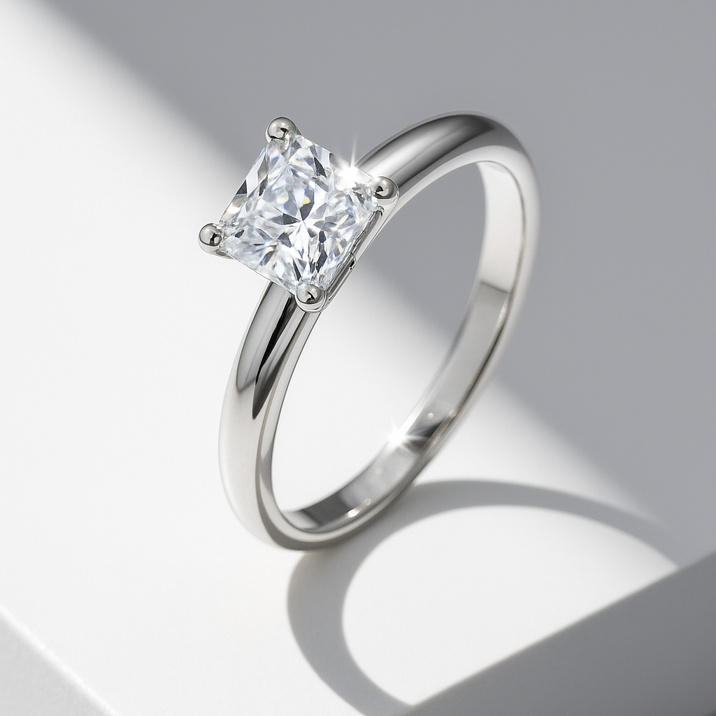• A princess-cut diamond solitaire that speaks of strength and grace. The clean, modern lines of the band elevate the brilliance of the square diamond, making it a timeless statement of enduring commitment. Available in white, yellow, or rose gold for a customized royal touch.