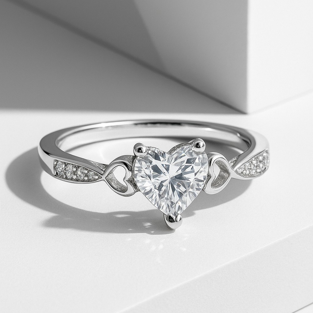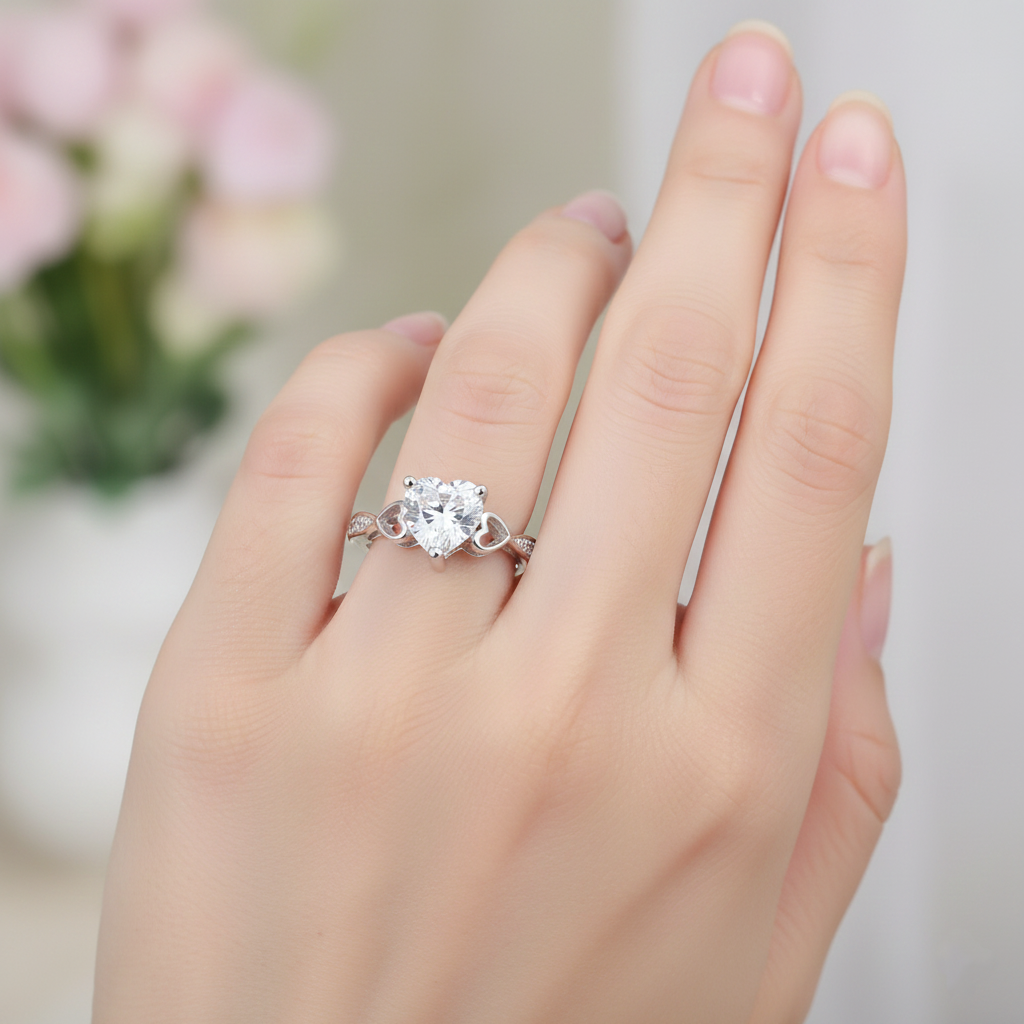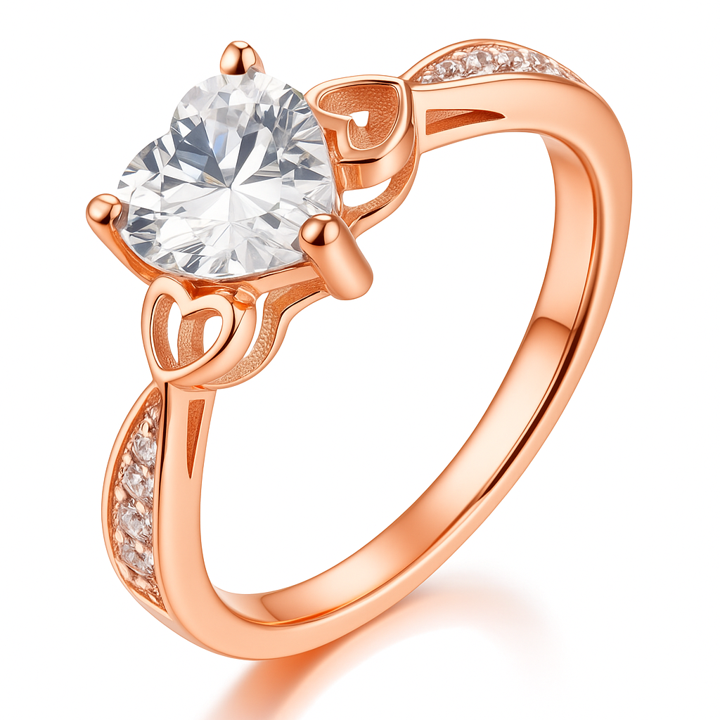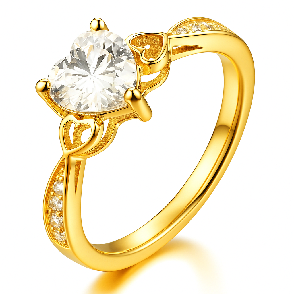 A classic round stone rises above a band adorned with delicate heart motifs, whispering romance with every sparkle. This ring captures the soul of true love, a harmony of strength, sentiment, and everlasting promise.