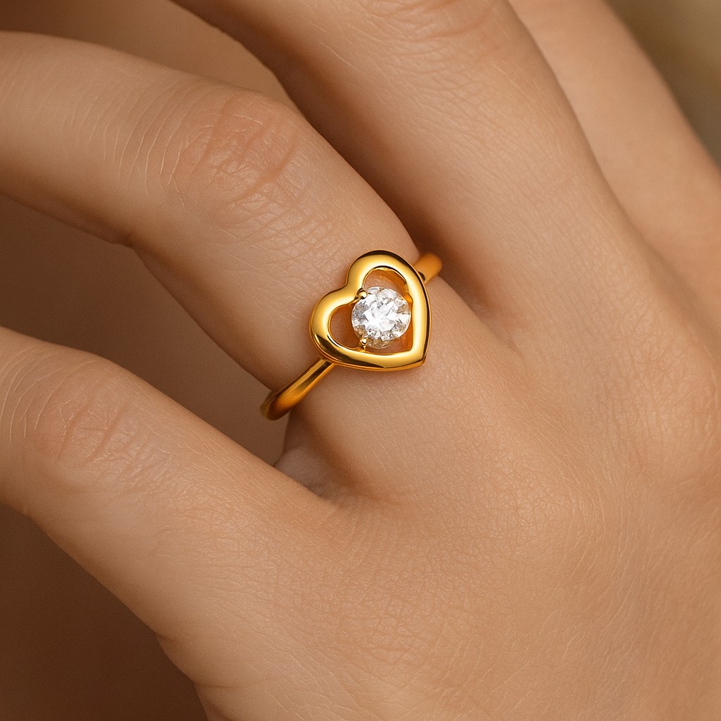 • Romance made eternal. A radiant round diamond is cradled inside a bold golden heart, a fusion of passion and elegance. This design captures love’s warmth in every detail, making it a sentimental and sophisticated jewel. Available in white, yellow and rose gold.