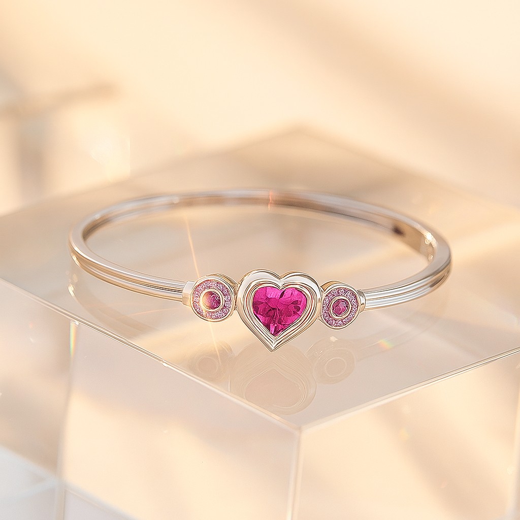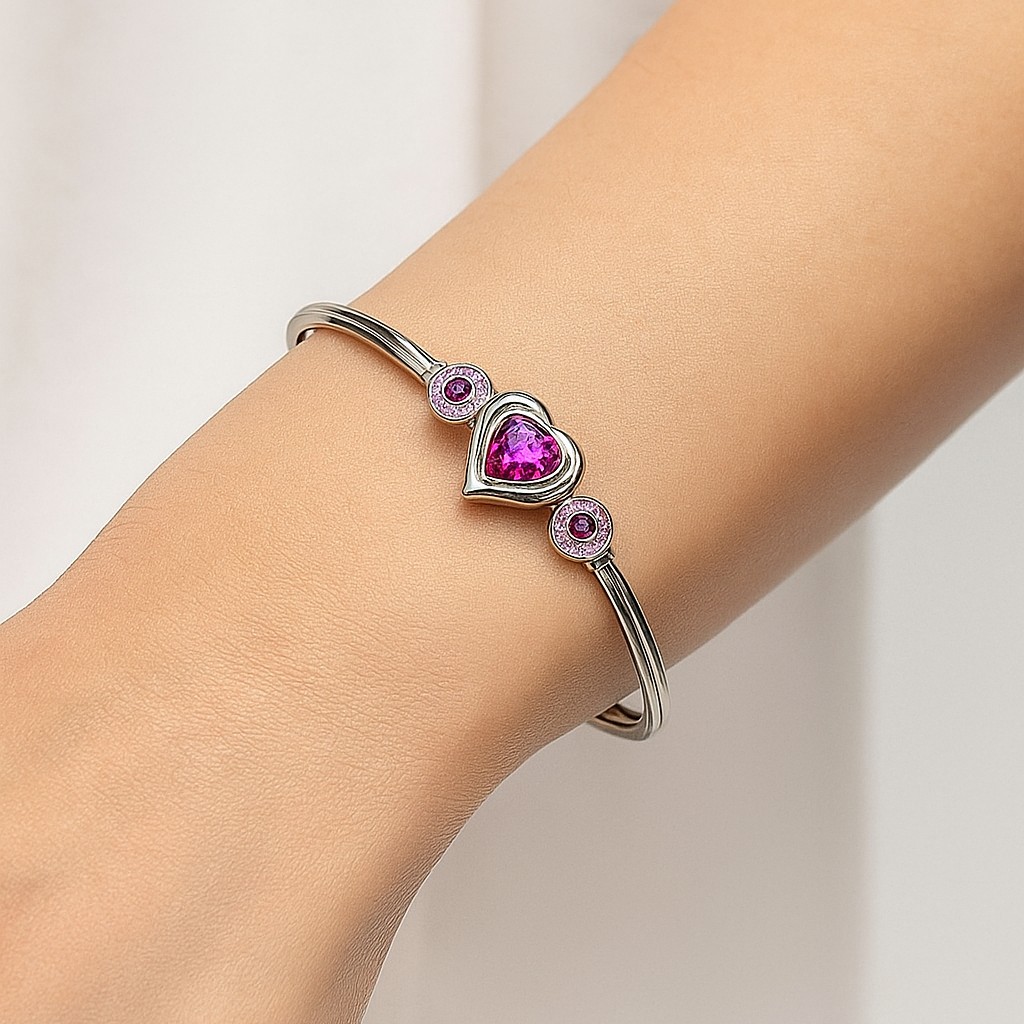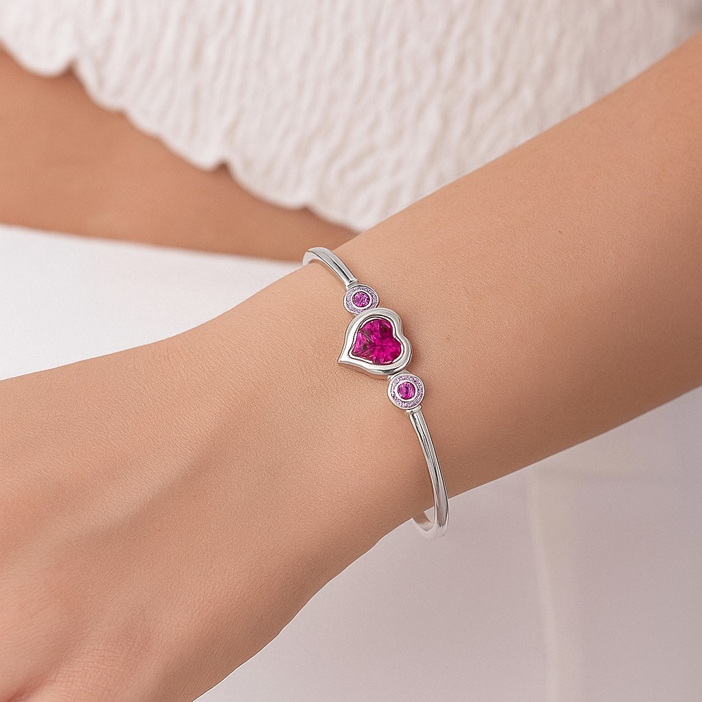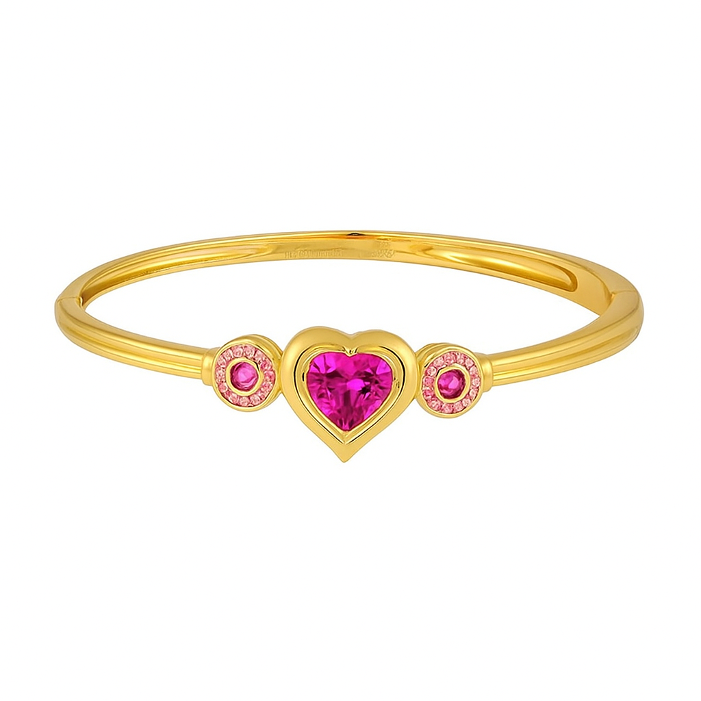 At its center rests a vivid pink sapphire in the shape of a heart, flanked by two brilliant companions, creating a glowing celebration of love and passion. Its spirited hue is tender yet powerful, a reminder of joy and devotion made eternal in gemstone form. The surrounding diamonds heighten the drama, adding an ethereal sparkle that magnifies the pink sapphire’s charm. Romantic and radiant, this bangle is a perfect testament to milestones of the heart.