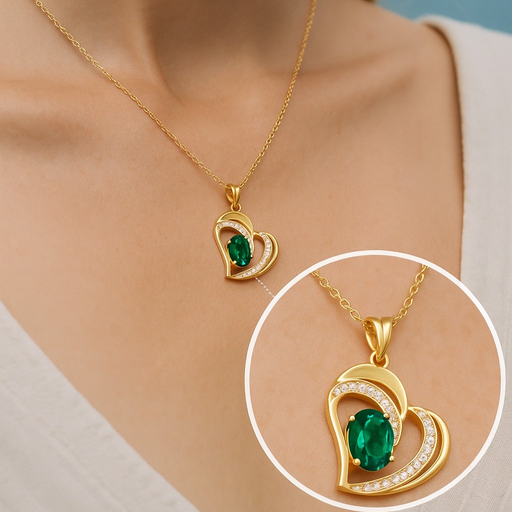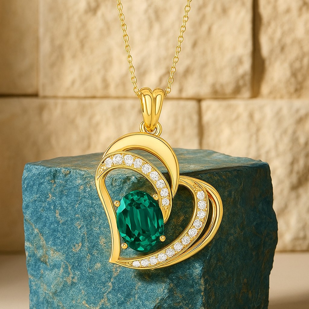 A bold oval emerald lies within a sculpted golden heart, accented with a trail of diamonds. The piece symbolizes love rooted in growth and prosperity—a tribute to devotion that flourishes endlessly. Both passionate and serene, this pendant holds love close.
