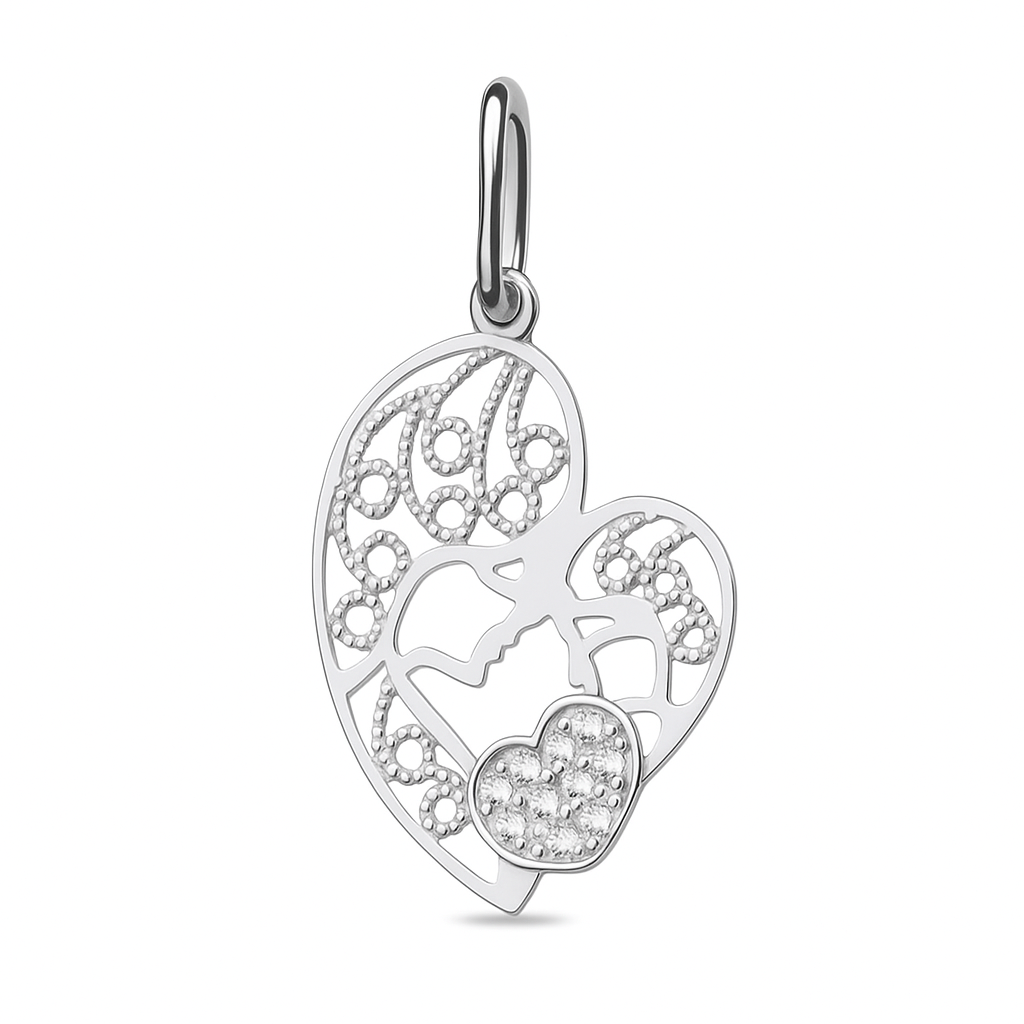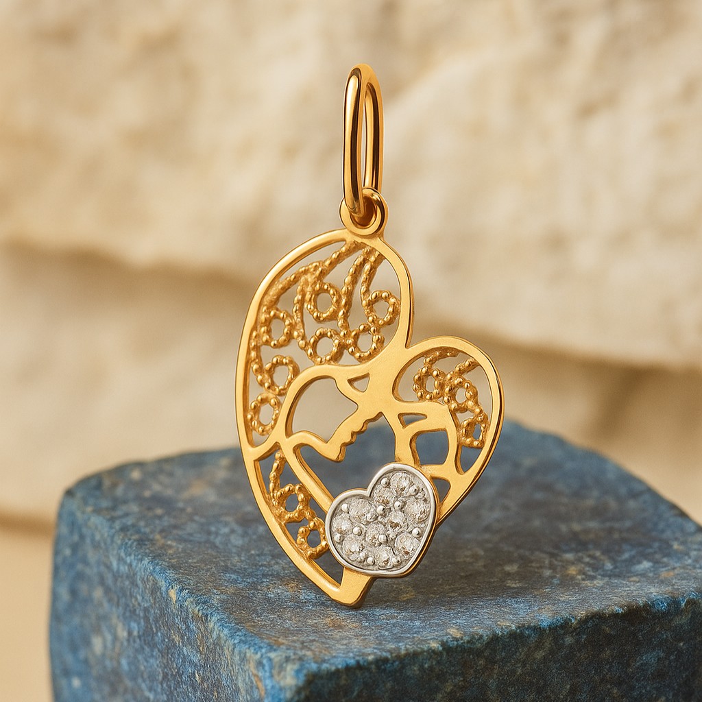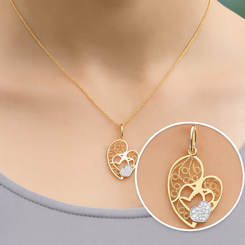 • A dual-heart pendant in yellow gold and diamonds, entwined in delicate filigree. One heart gleams in gold, the other sparkles in white brilliance — together they symbolize connection, devotion, and the intertwining of two souls into one.