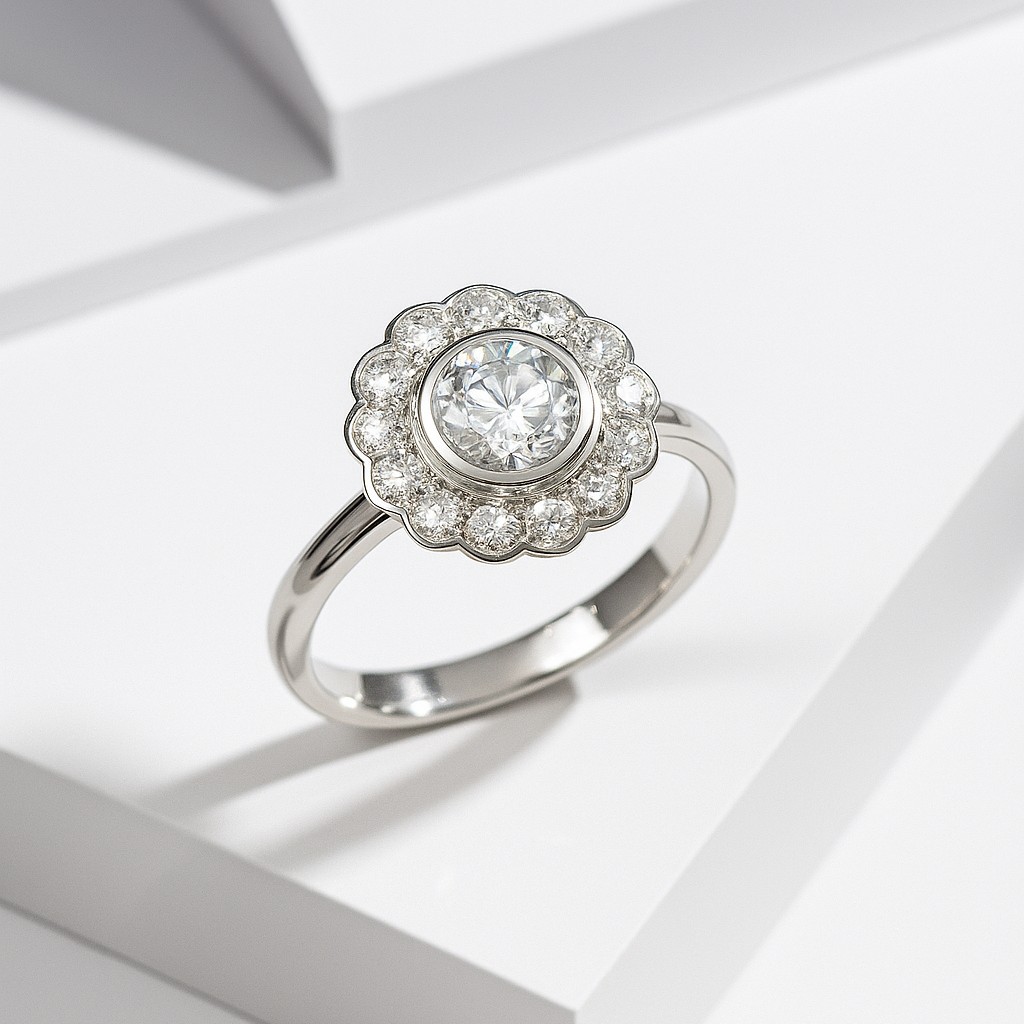 A bezel-set diamond surrounded by a delicate scalloped halo of round brilliants, evoking vintage romance and the artistry of old-world craftsmanship. A timeless heirloom in the making.