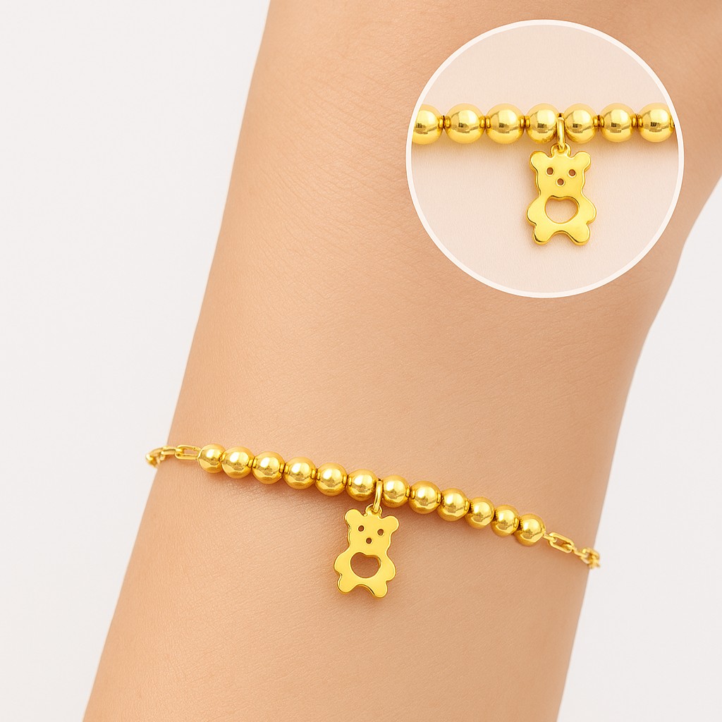 • Sweet, modern, and full of charm — this 916 gold bracelet combines gleaming 4mm beads with an adorable 7mm bear pendant that captures a youthful, joyful spirit. Crafted with fine detail, it’s a perfect mix of fun and sophistication, making it easy to pair with any outfit. Whether worn solo or layered, this bracelet adds a touch of whimsy and shine to your everyday look. A delightful piece that celebrates innocence, love, and golden moments.
