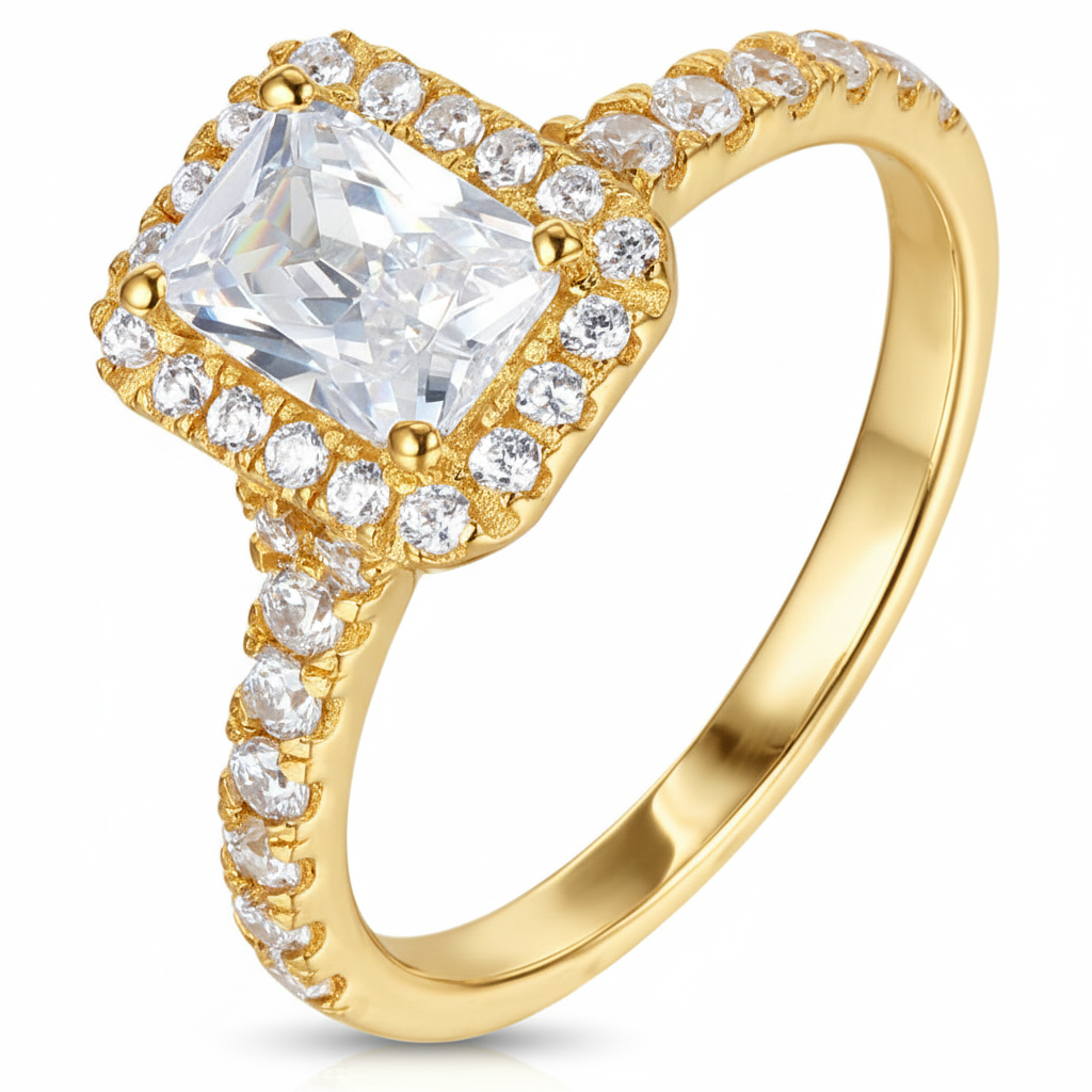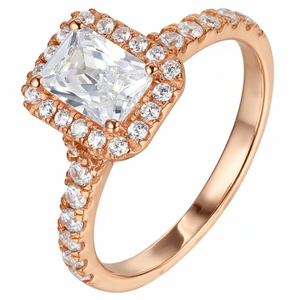 • A striking emerald-cut diamond takes center stage in this masterpiece, framed by a precision halo that amplifies its crisp clarity and mirror-like brilliance. Each facet reflects light with bold elegance, creating an aura of grandeur.