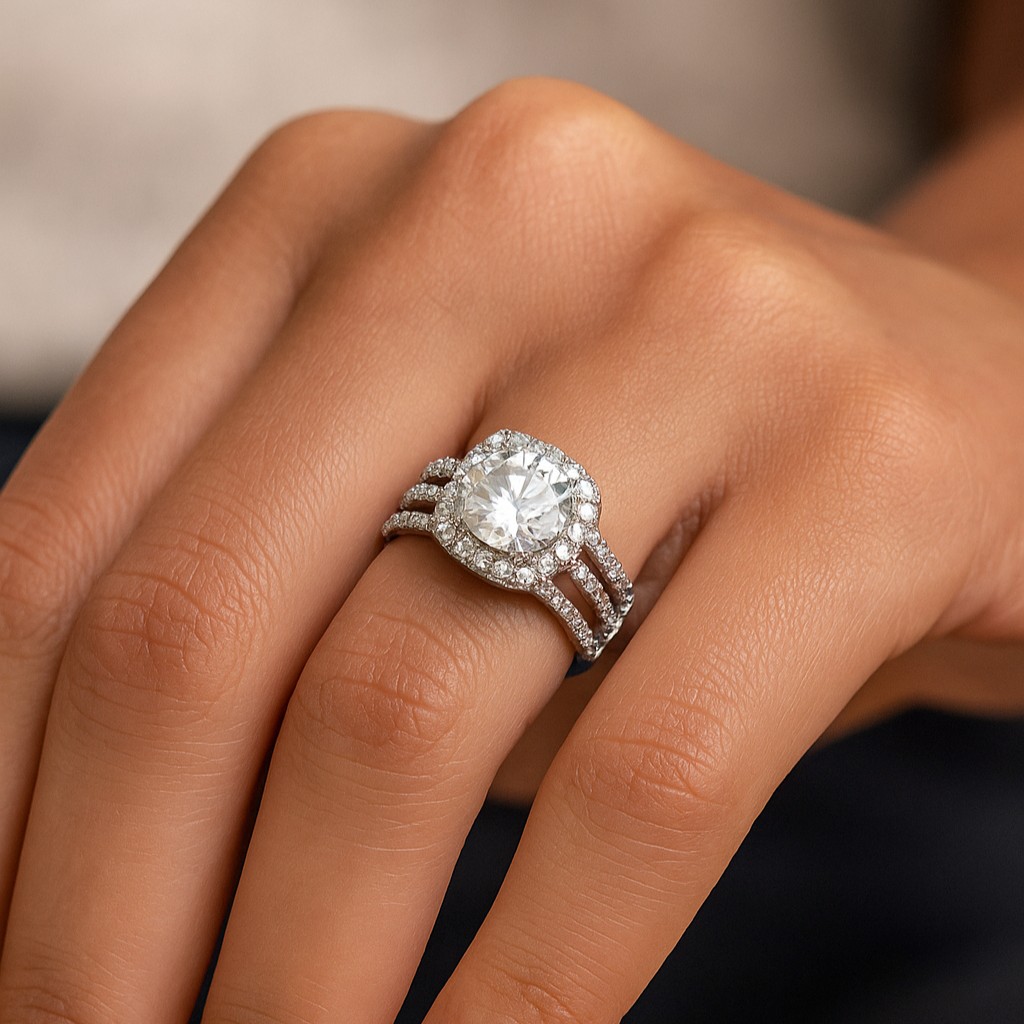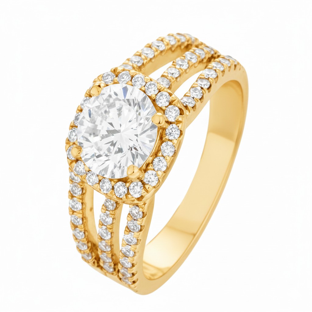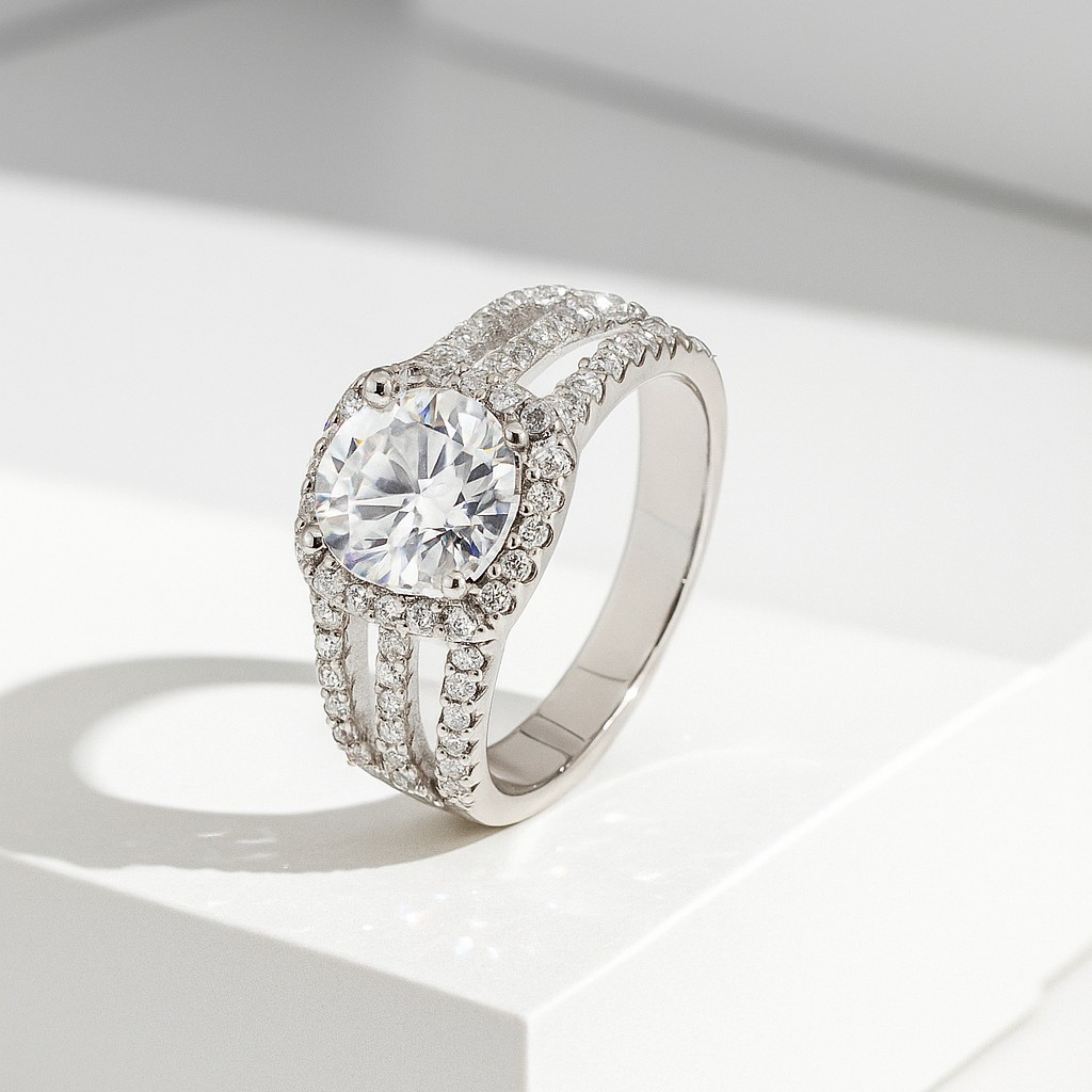 Twin rows of pavé diamonds embrace the solitaire at the heart, forming a design of symmetry and strength. Each facet reflects infinite light, creating an aura of bold luxury. A statement ring that embodies both glamour and timeless devotion.