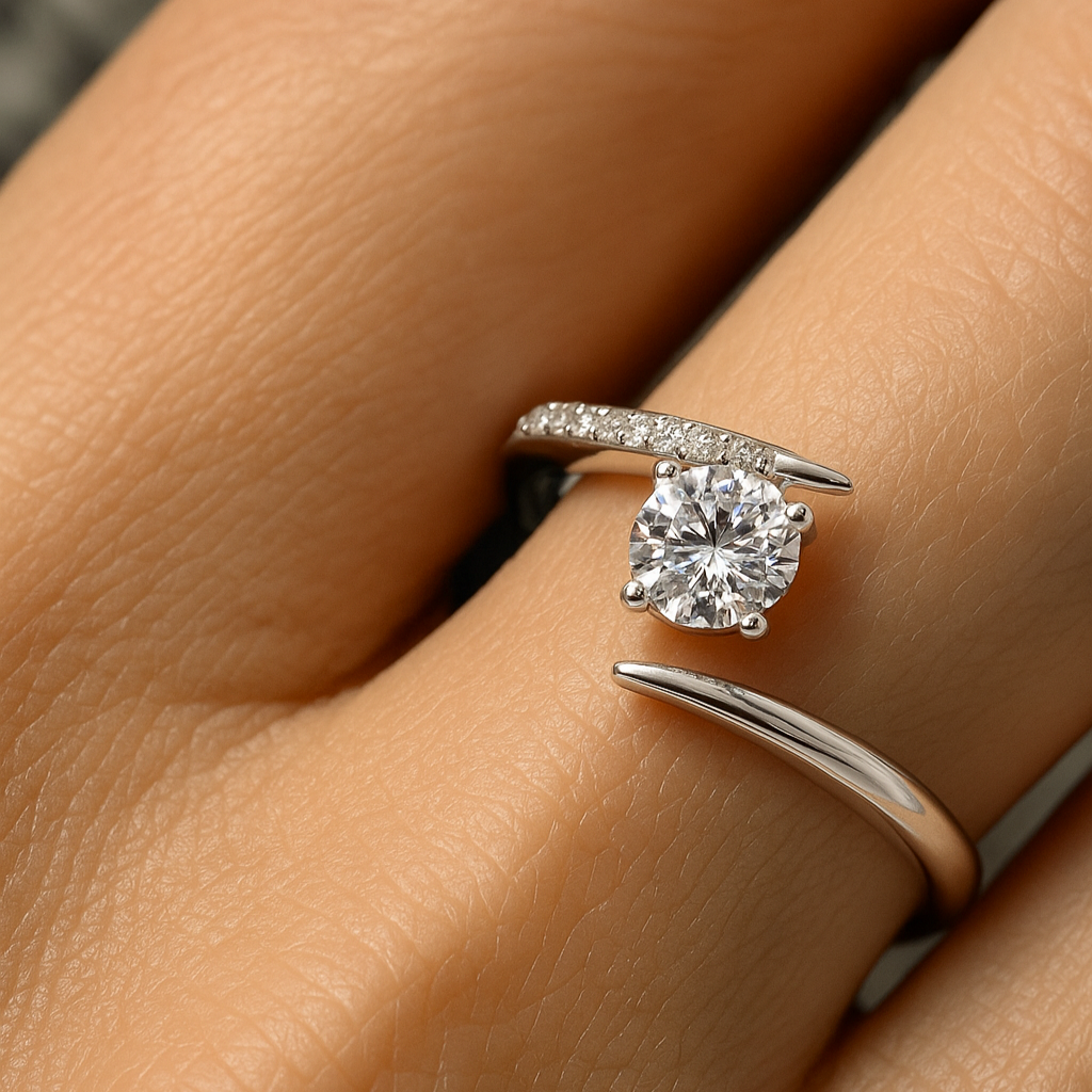 The diamond seems to hover in space, set into an open arc of precious metal that flows seamlessly around the finger. Minimalist yet striking, this design evokes infinity, reminding the wearer that true love transcends time and form. A ring for the modern romantic with a soul that seeks the eternal.