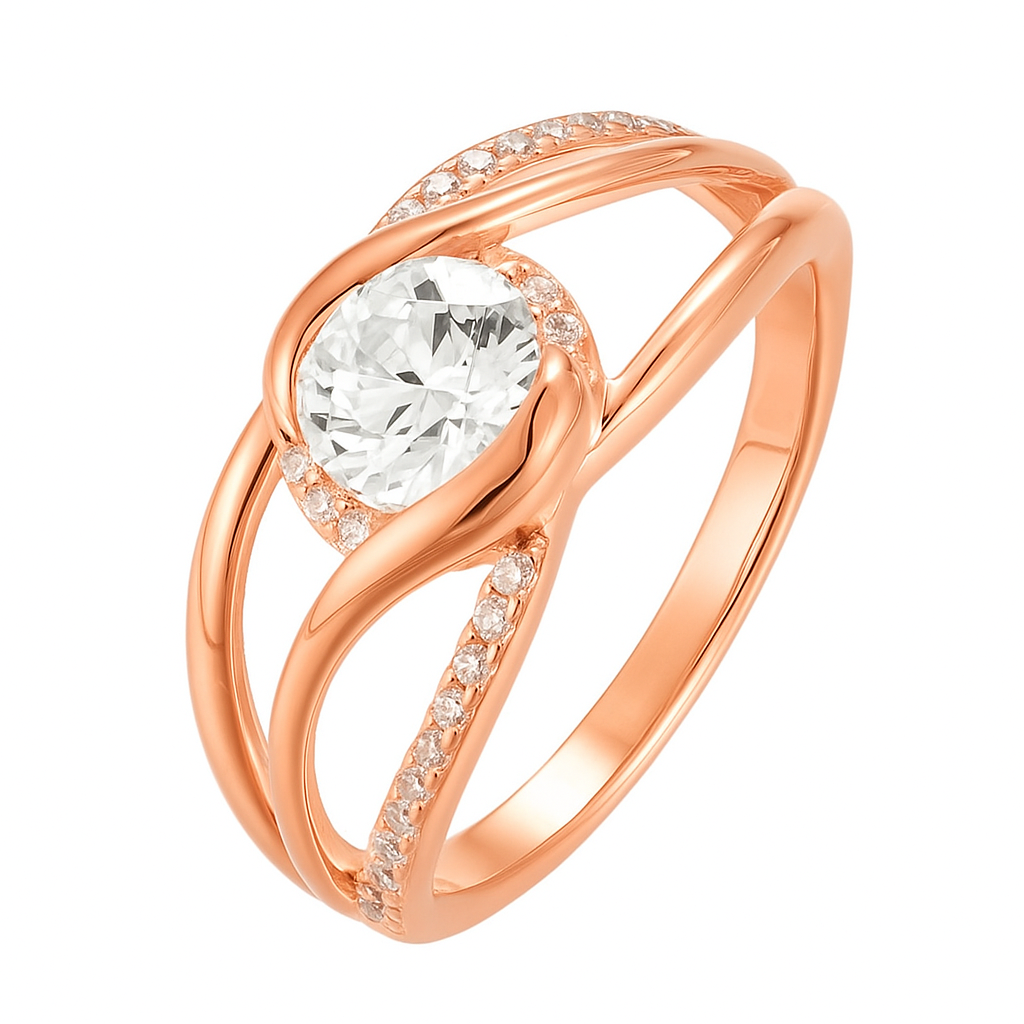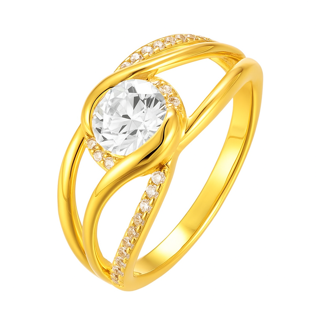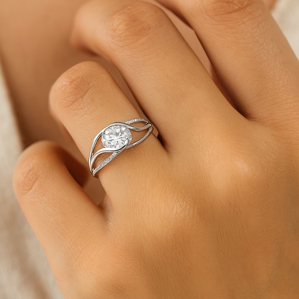 Fluid bands of precious metal entwine gracefully around a radiant round diamond, symbolizing eternity and boundless connection