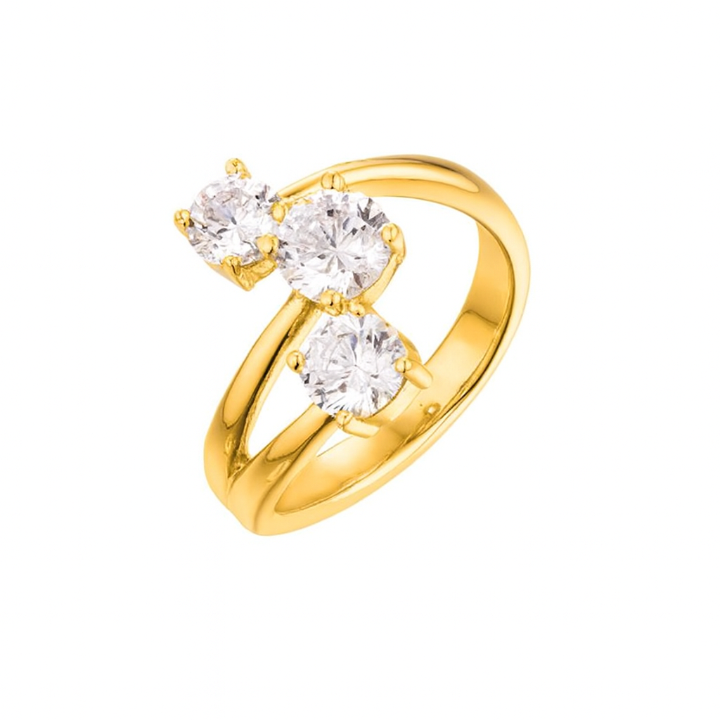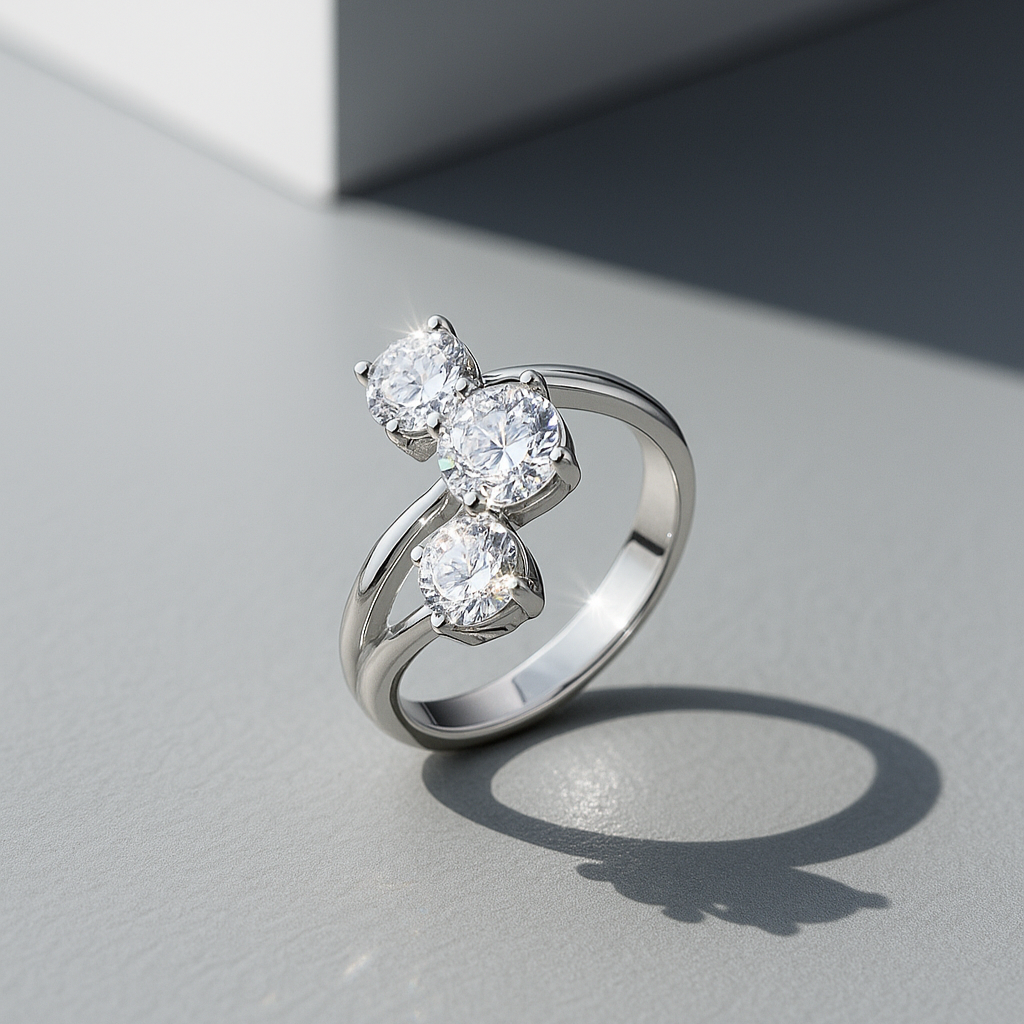 A sculptural bypass band in 18k gold carries three radiant diamonds, symbolizing past, present, and future bound in harmony. Each VS1 diamond is set to capture light from every angle, creating a flowing rhythm of brilliance. Sleek yet emotionally charged, this ring speaks of continuity, milestones, and the beauty of love’s unfolding journey.