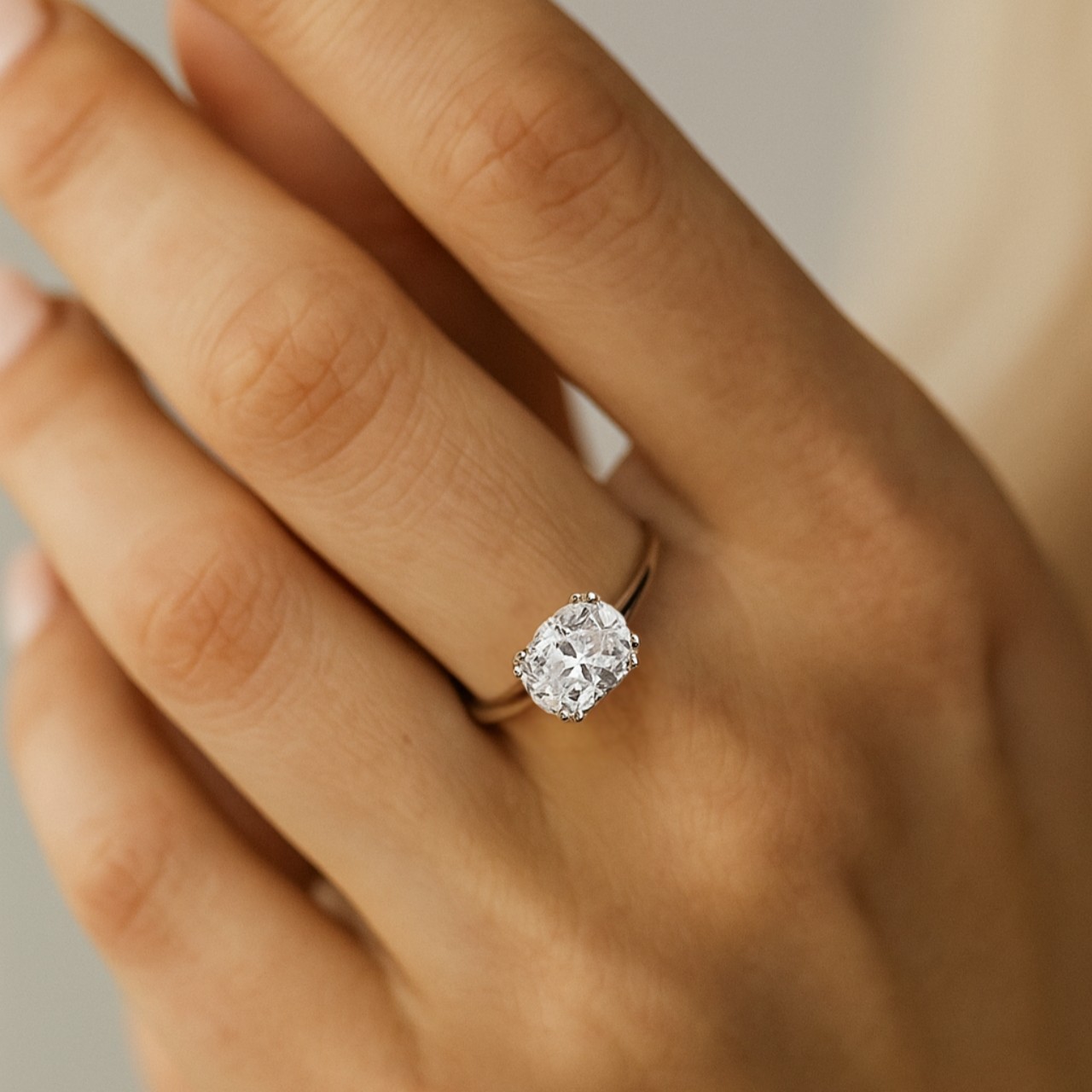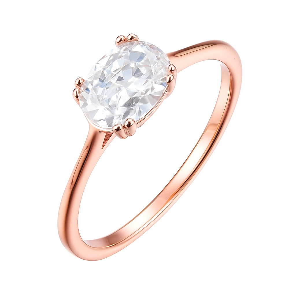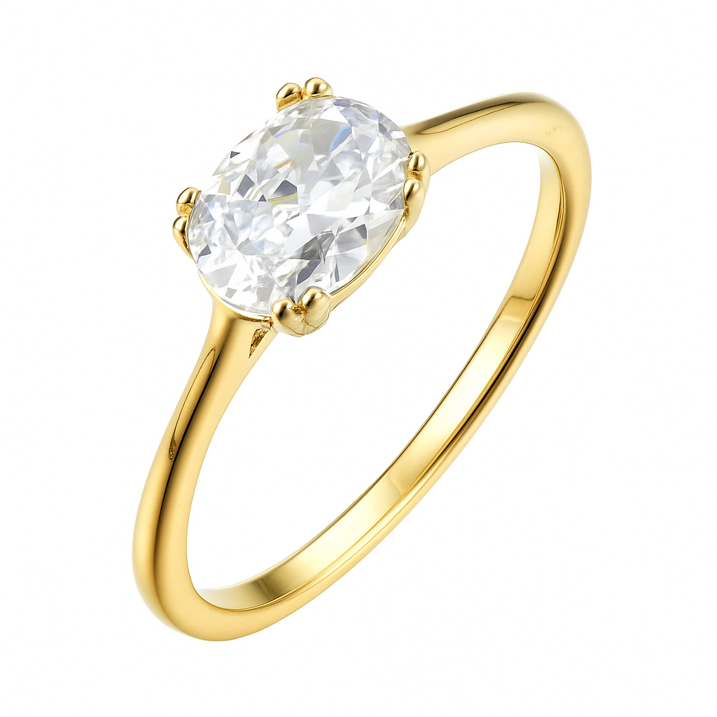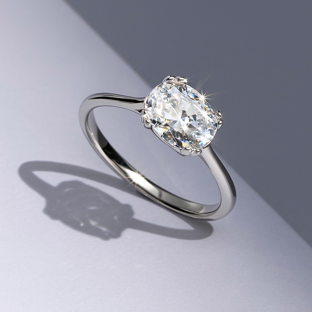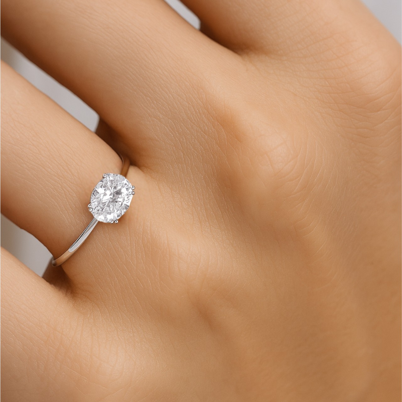 An oval diamond, delicate and refined, poised upon a slim band of precious gold. Its slender silhouette radiates softness, a quiet yet profound celebration of love’s clarity — whispering promises that last a lifetime.