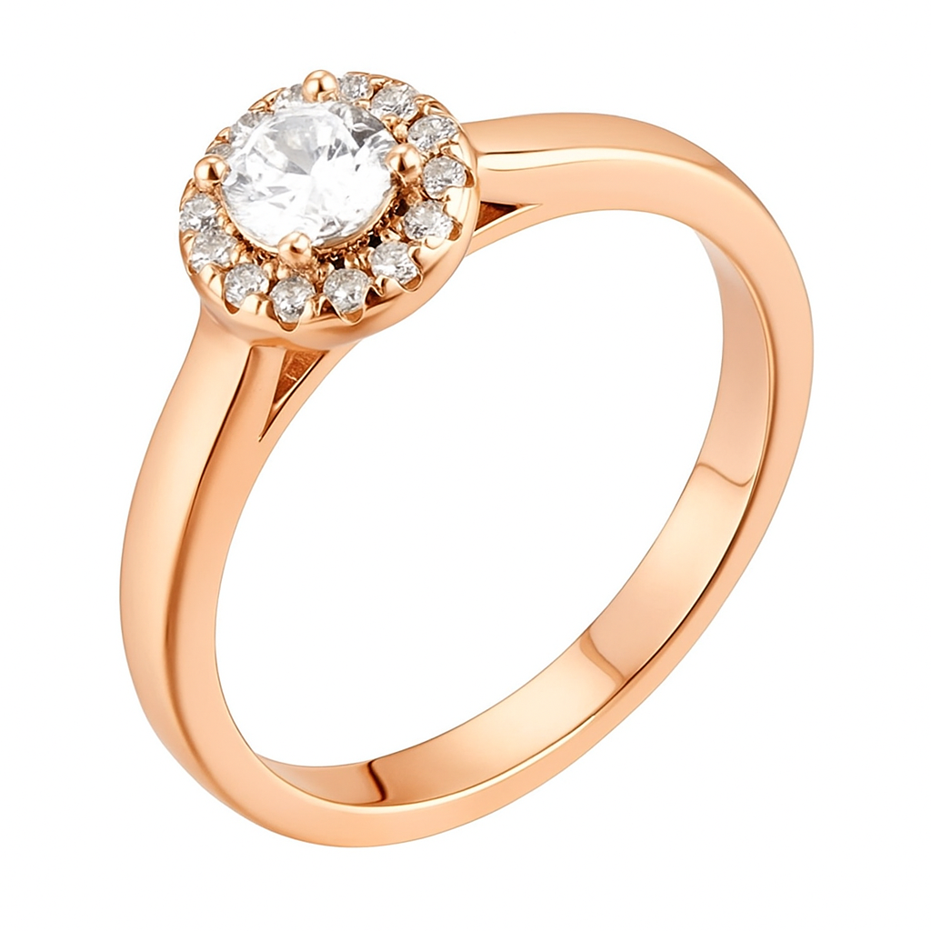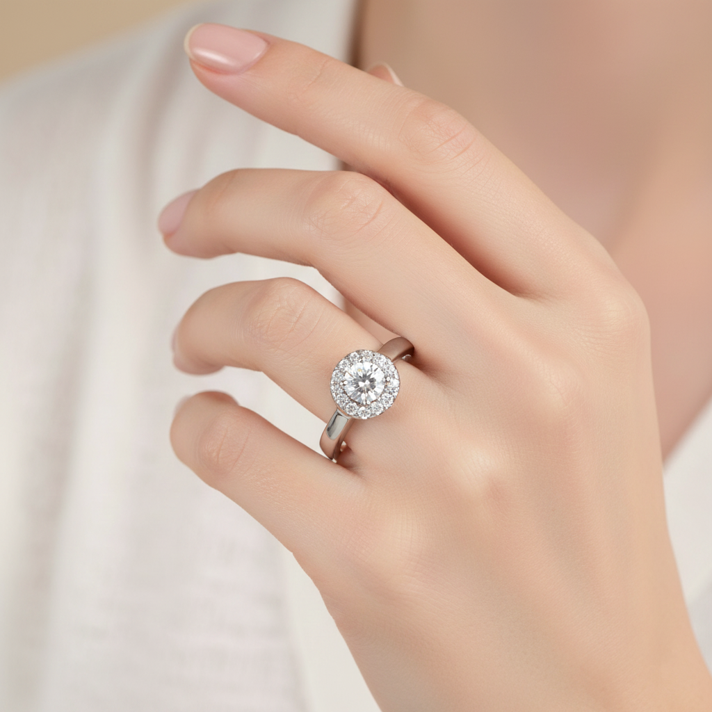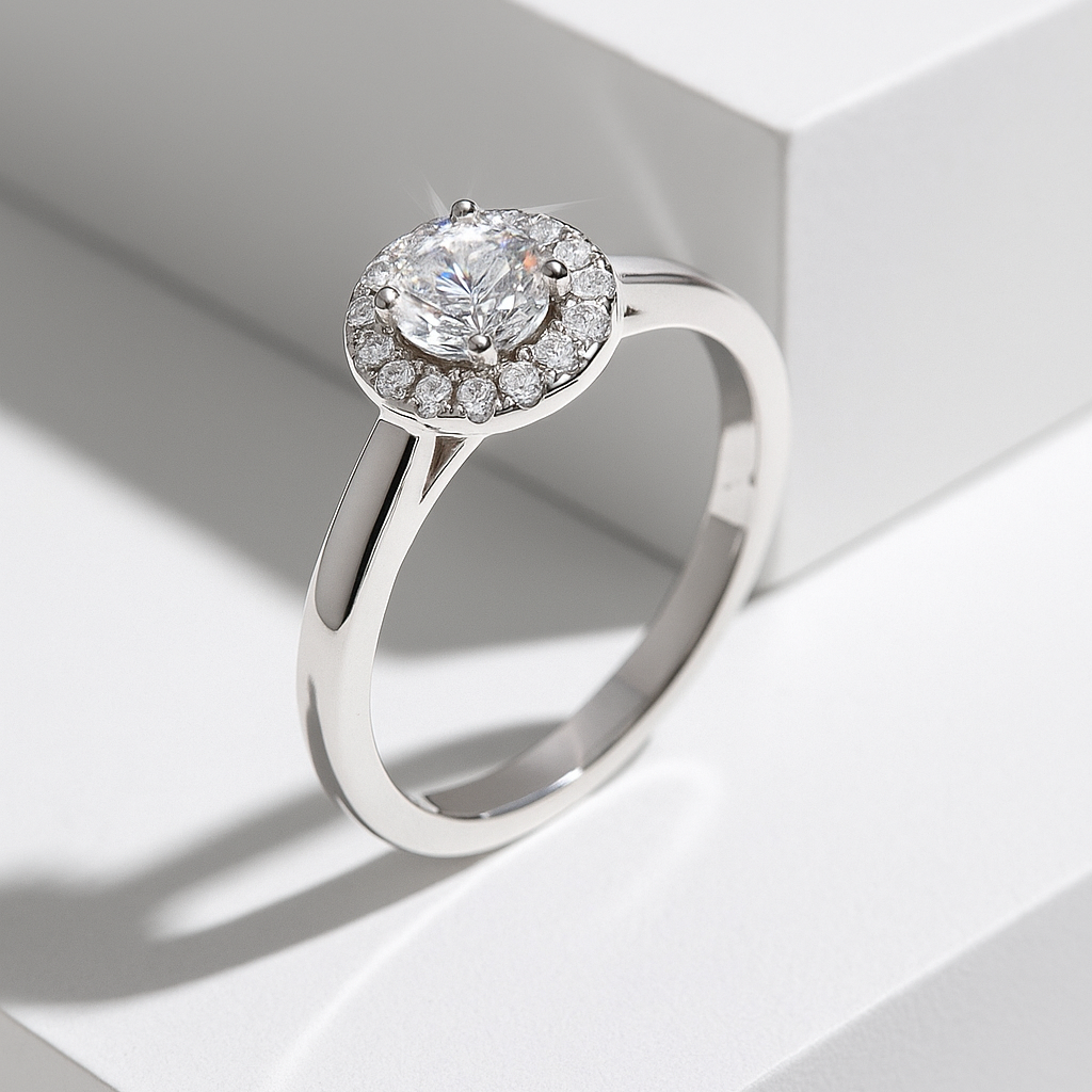 A singular round diamond glows within a halo of smaller stones, the simplicity of its plain band enhancing the gem’s brilliance. This design captures clarity and stillness — a meditative piece that speaks of quiet strength, enduring affection, and timeless serenity.