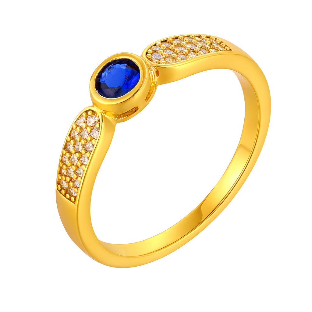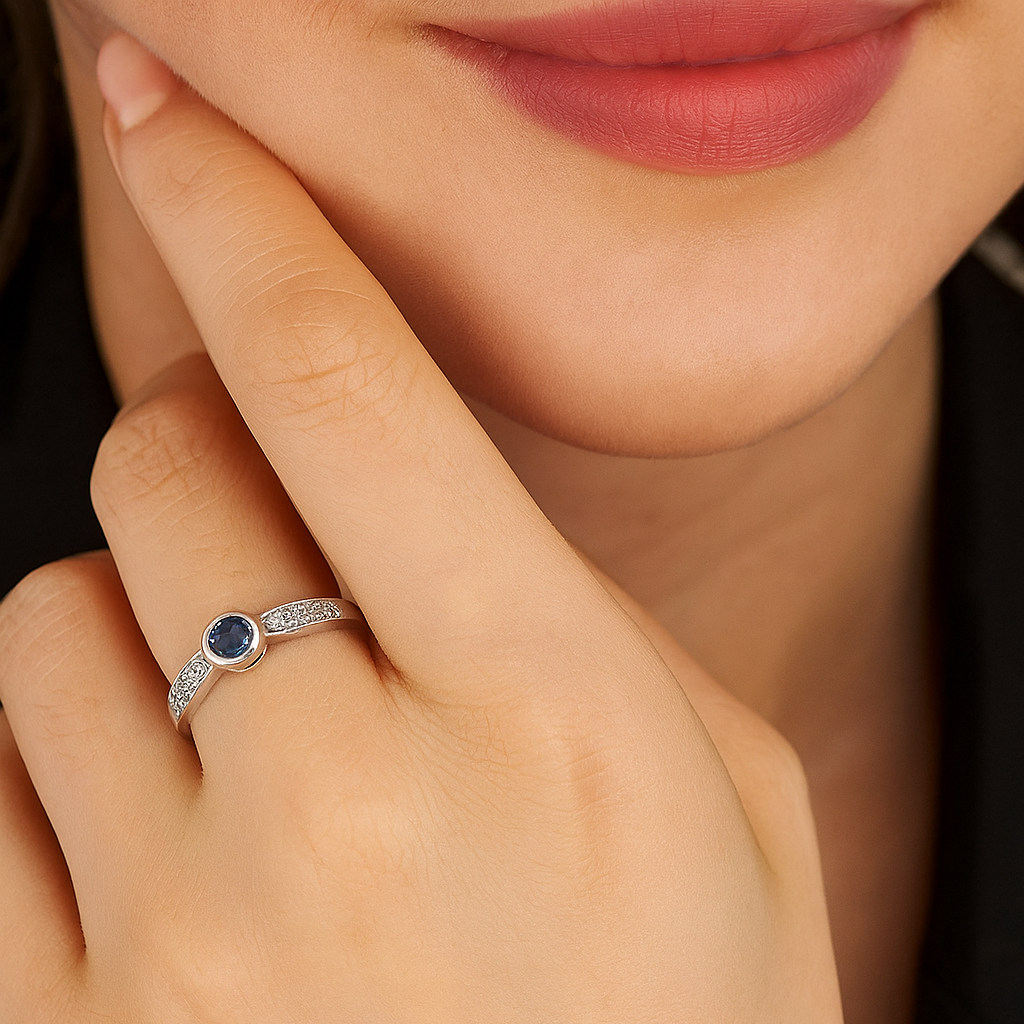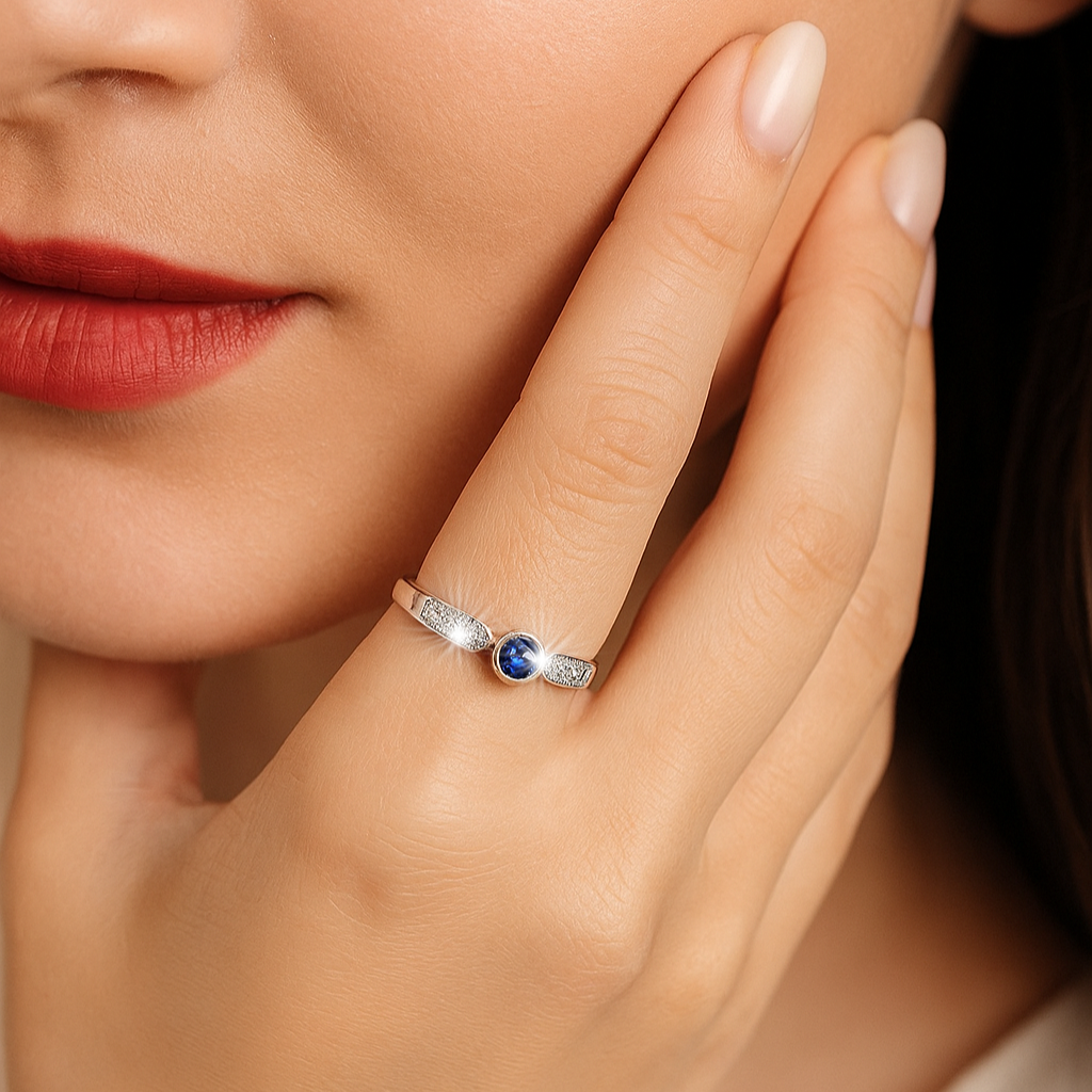 A vivid sapphire sits proudly at the center, framed by shimmering pavé-set diamonds on either side. Its deep midnight hue captures the essence of mystery and devotion, symbolizing loyalty and truth. The clean, modern silhouette makes this piece ideal for both daily wear and life’s unforgettable moments.
