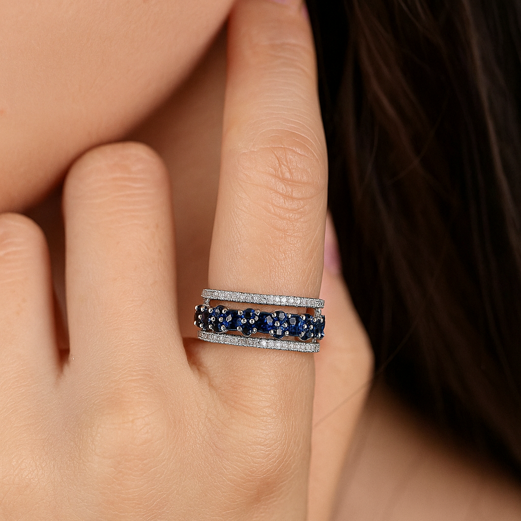 • Like gazing into a starlit sky, this band combines the depth of royal blue sapphires with the brilliance of VS1 diamonds. Set in polished white gold, two shimmering diamond rows cradle a constellation of sapphires, evoking a sense of eternal mystery and devotion. This ring is a celebration of depth, passion, and the allure of night’s eternal beauty.