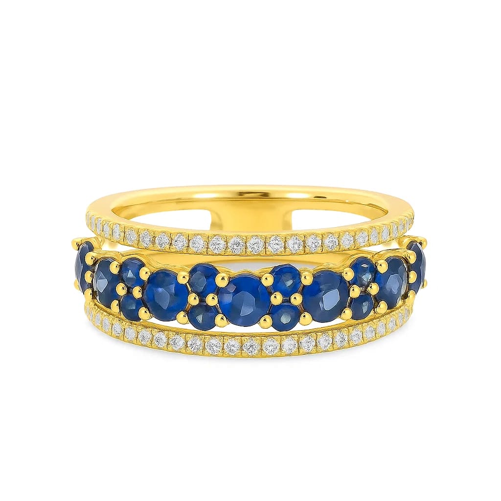 Like gazing into a starlit sky, this band combines the depth of royal blue sapphires with the brilliance of VS1 diamonds. Set in polished white gold, two shimmering diamond rows cradle a constellation of sapphires, evoking a sense of eternal mystery and devotion. This ring is a celebration of depth, passion, and the allure of night’s eternal beauty.