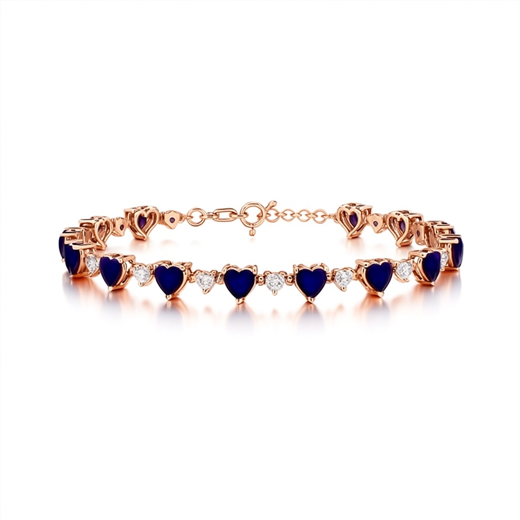 A delicate line of deep sapphire-blue hearts, embraced by luminous VS1 diamonds, creates a bracelet that is both playful and profoundly elegant. A poetic expression of love beneath the stars.
