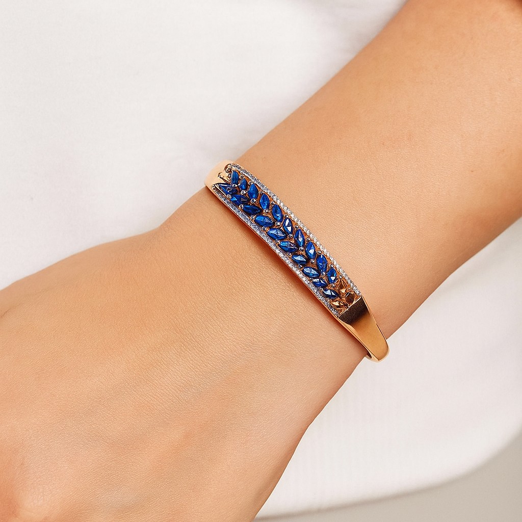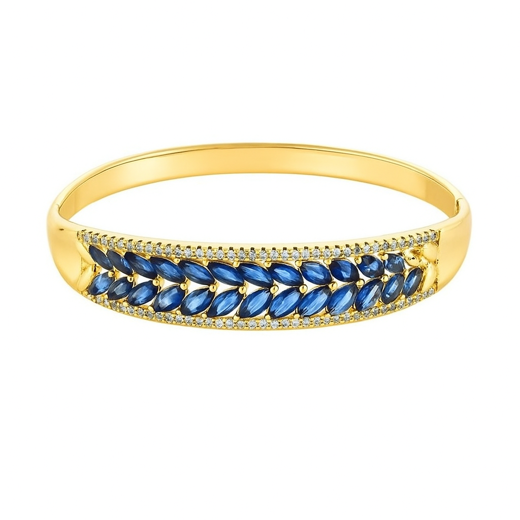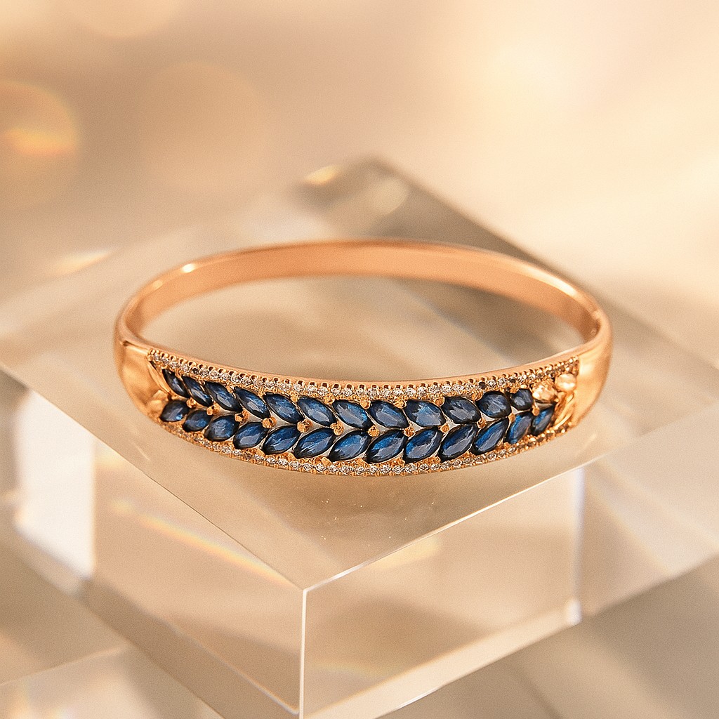 • A river of deep blue sapphires winds gracefully across the bangle, each marquise-cut gem set in a delicate vine-like pattern that breathes movement into stillness. The sapphires shimmer like twilight leaves kissed by moonlight, their richness amplified by the warmth of rose gold that encases them. Along the edges, a fine border of VS1 diamonds creates a luminous frame, their pure fire contrasting with the sapphires’ midnight depths. This is not just a jewel, but a celebration of duality — fire and ice, dusk and dawn, delicacy and strength. Worn alone, it commands attention; layered, it whispers of luxury that needs no words.
