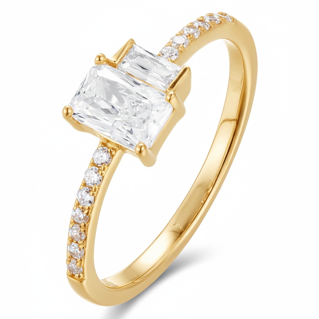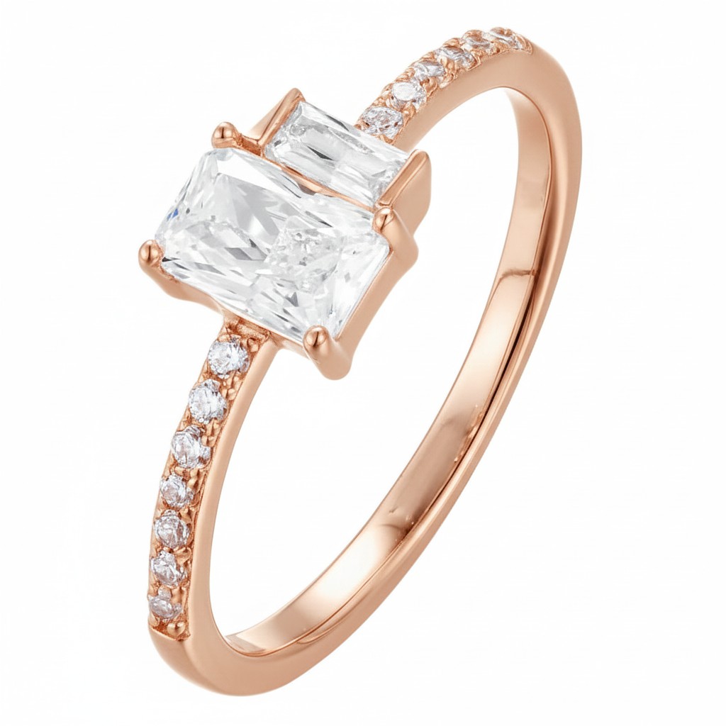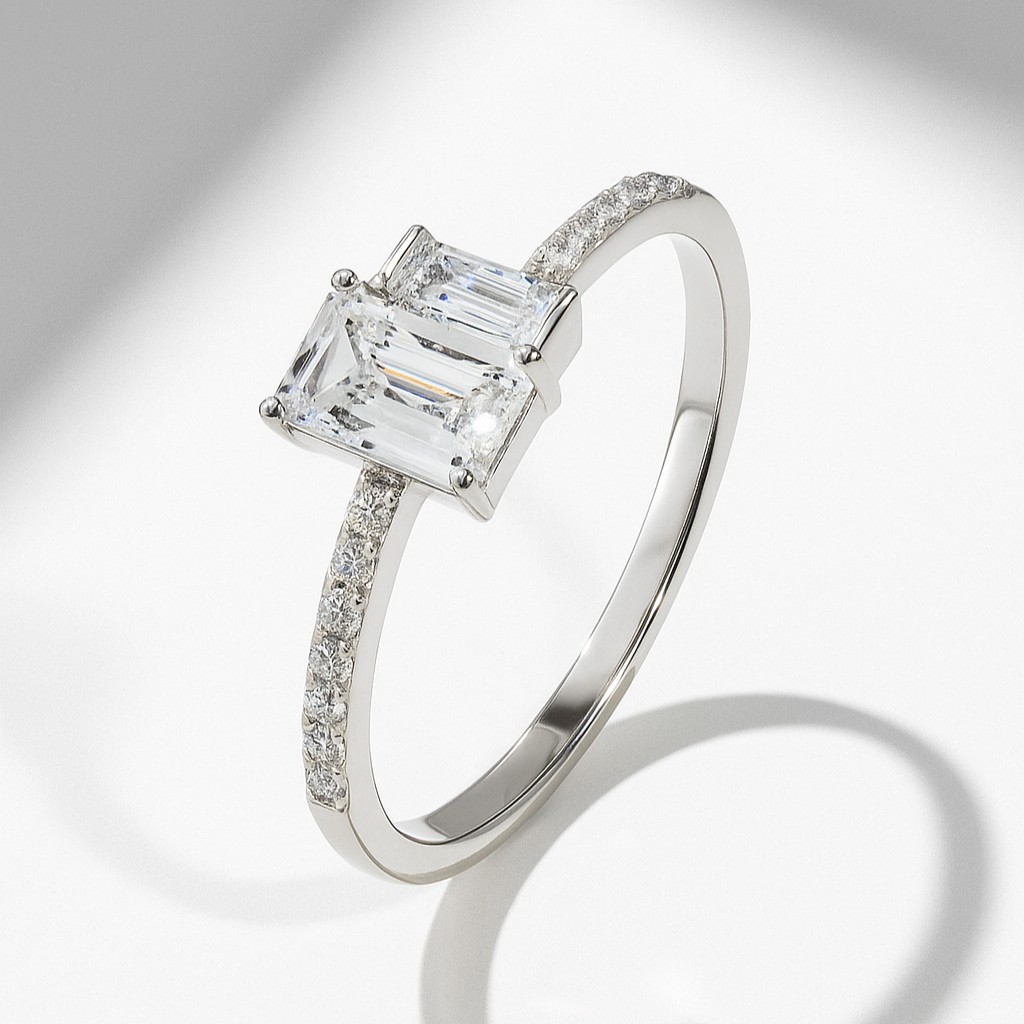 This sleek design celebrates the sophistication of geometry with a striking emerald-cut diamond. Its elongated facets create flashes of mirror-like brilliance, accentuated by a slim pavé diamond band that balances minimalism with radiance. The prong setting elevates the stone, giving it prominence while ensuring light enters from all angles. Modern, polished, and endlessly versatile, this ring is an ode to clarity and refined taste.
